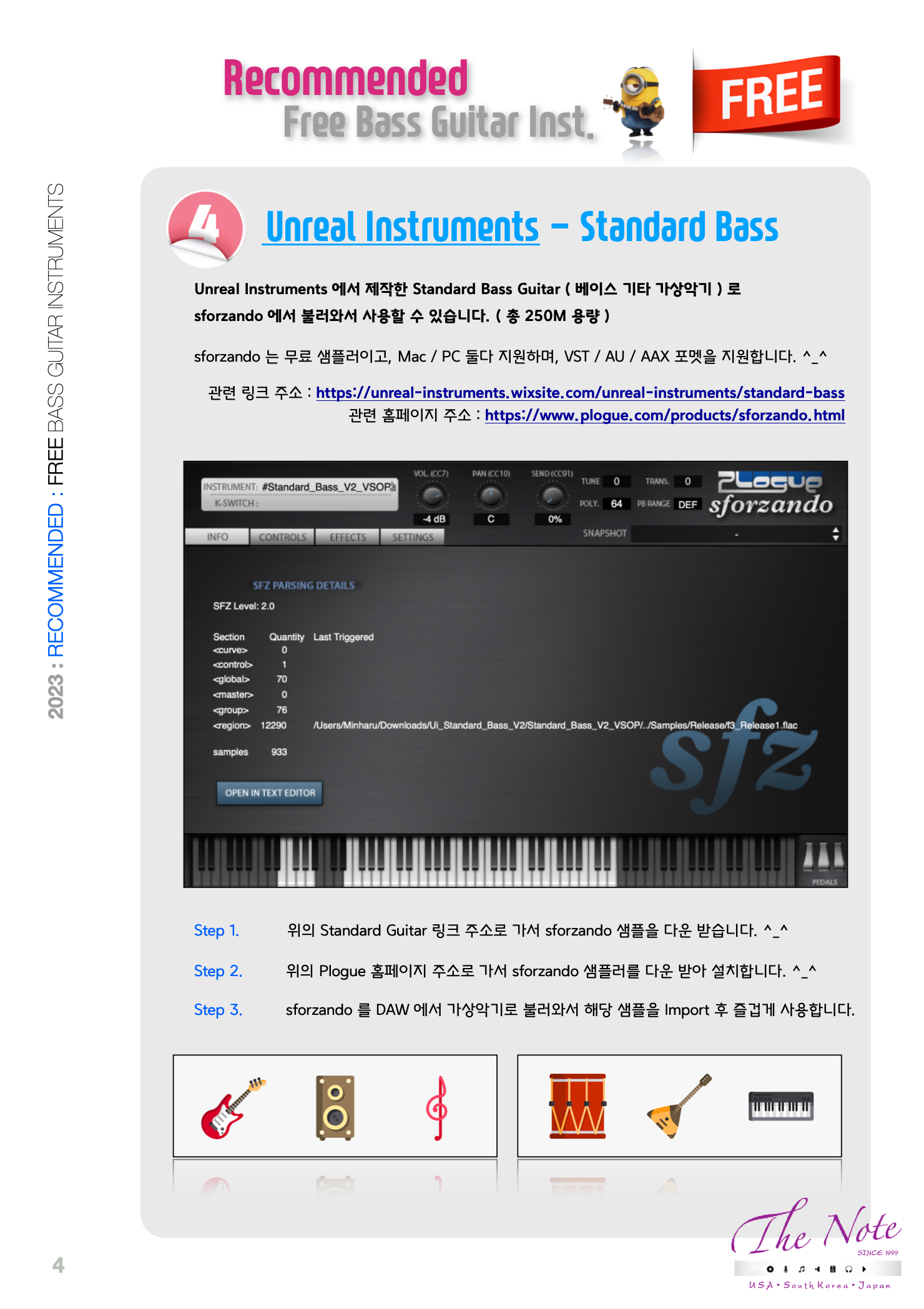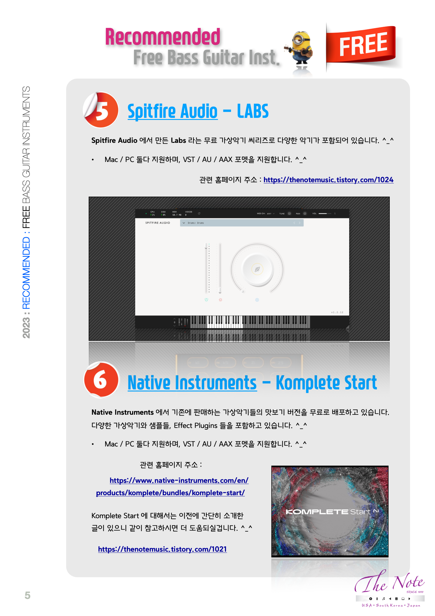 Recommended Free Bass Guitar Inst. 추천하는 무료 Bass 가상악기 리스트 : 2023 무료 Bass 가상악기들 중에서 추천하는 것들을 모아봤습니다. ^_^ by The Note 요즘엔 컴퓨터 한대만 있으면 예전처럼 하드웨어를 쌓아놓지 않아도 다양한 음악을 할 수 있습니다. ^_^ 그런데 가상악기에 많은 돈을 쓰게 되고, 연초에 주머니가 가벼워져서 마음이 안타까운 분들을 위해 오늘은 취미로 음악하시는 분들과 전문적으로 음악하시는 분들에게도 도움이 되고, 쓰임새가 있는 무료 가상악기들의 추천 List 를 만들어봤습니다. ^_^ 다섯번째 편으로 Free Bass Guitar VST Instruments ( 무료 베이스 기타 가상악기들 ) 입니다. ^_^ 2023년 10월 현재 무료로 사용할 수 있는 Bass Guitar VST Instruments ( 무료 베이스 가상악기 ) 는 상당히 많이 있지만 이 중 개인적으로 추천할만한 것들은 총 6개가 있습니다. ^_^ Electric Bass Guitar ( 일렉 베이스 기타 ) 5종류 를 추천해봅니다. ^_^ 추천하는 대부분의 가상악기는 Mac / PC 둘다 지원하며, VST / AU 방식을 지원합니다. ^_^ ( AAX 포멧은 일부만 ) Ample Sound - Bass P II Lite 기타 가상악기 관련해서 많이 사용되는 Ample Sound 의 무료 베이스 기타 가상악기입니다. ^_^ Precision Bass 를 가상악기로 옮겨 놓은 것으로, 무료지만 좋은 소리를 내주기에 추천합니다. ^^ Mac / PC 둘다 지원하며, VST / AU / AAX 포멧을 지원합니다. ^_^ 관련 홈페이지 주소 : http://www.amplesound.net/en/pro-pd.asp?id=19 ( 홈페이지 상단 Download 에서 받으면 됩니다. ^_^ ) 베이스 기타 관련해서도 예전에 올려 놓은 강좌가 있으니 같이 보시면 더 도움되실겁니다. ^_^ https://thenotemusic.tistory.com/4 IK Multimedia - MODO Bass 2 CS IK Multimedia 의 MODO Bass 2 는 다양한 Bass Guitar 를 모델링한 베이스 가상악기입니다. MODO Bass 2 CS 버전을 설치하면 기본 1개의 베이스 기타 ( Precision Bass ) 가 포함되어 있습니다. Mac / PC 둘다 지원하며, VST / AU / AAX 포멧을 지원합니다. ^_^ 관련 홈페이지 주소 : https://www.ikmultimedia.com/products/modobass2/ Impact Soundworks - Shreddage 3 Precision Free Impact Soundworks 의 Shreddage 3 Precision 베이스 기타 무료 버전입니다. Native Instruments 의 Kontakt 또는 Kontakt Player 로 사용할 수 있습니다. Mac / PC 둘다 지원하며, VST / AU / AAX 포멧을 지원합니다. 관련 홈페이지 주소 : https://impactsoundworks.com/product/shreddage-3-precision-free/ Unreal Instruments - Standard Bass Unreal Instruments 에서 제작한 Standard Bass Guitar ( 베이스 기타 가상악기 ) 로 sforzando 에서 불러와서 사용할 수 있습니다. ( 총 250M 용량 ) sforzando 는 무료 샘플러이고, Mac / PC 둘다 지원하며, VST / AU / AAX 포멧을 지원합니다. ^_^ 관련 링크 주소 : https://unreal-instruments.wixsite.com/unreal-instruments/standard-bass 관련 홈페이지 주소 : https://www.plogue.com/products/sforzando.html Step 1. 위의 Standard Guitar 링크 주소로 가서 sforzando 샘플을 다운 받습니다. ^_^ Step 2. 위의 Plogue 홈페이지 주소로 가서 sforzando 샘플러를 다운 받아 설치합니다. ^_^ Step 3. sforzando 를 DAW 에서 가상악기로 불러와서 해당 샘플을 Import 후 즐겁게 사용합니다. Spitfire Audio - LABS Spitfire Audio 에서 만든 Labs 라는 무료 가상악기 씨리즈로 다양한 악기가 포함되어 있습니다. ^_^ Mac / PC 둘다 지원하며, VST / AU / AAX 포멧을 지원합니다. ^_^ 관련 홈페이지 주소 : https://thenotemusic.tistory.com/1024 Native Instruments - Komplete Start Native Instruments 에서 기존에 판매하는 가상악기들의 맛보기 버전을 무료로 배포하고 있습니다. 다양한 가상악기와 샘플들, Effect Plugins 들을 포함하고 있습니다. ^_^ Mac / PC 둘다 지원하며, VST / AU / AAX 포멧을 지원합니다. ^_^ 관련 홈페이지 주소 : https://www.native-instruments.com/en/products/komplete/bundles/komplete-start/ Komplete Start 에 대해서는 이전에 간단히 소개한 글이 있으니 같이 참고하시면 더 도움되실겁니다. ^_^ https://thenotemusic.tistory.com/1021