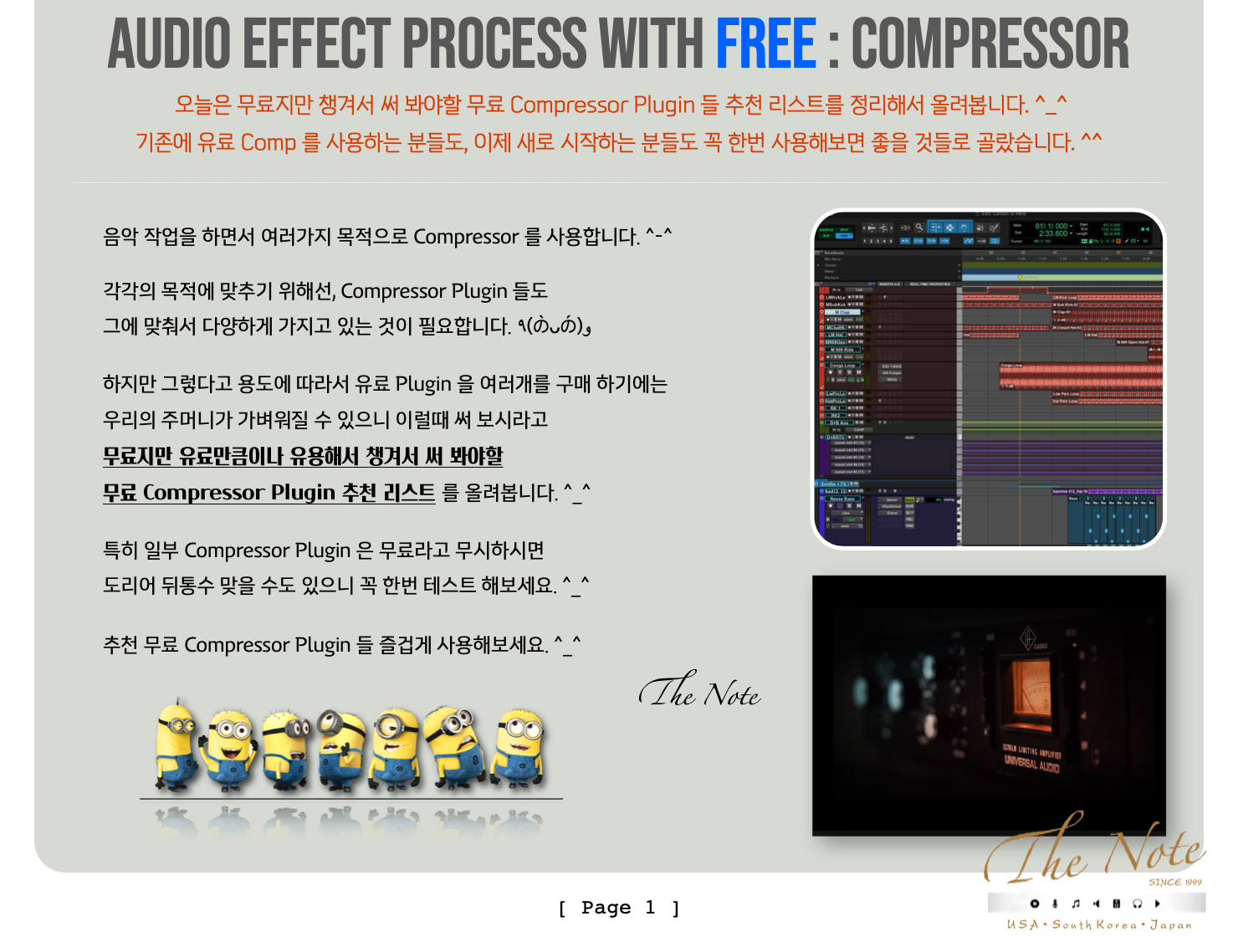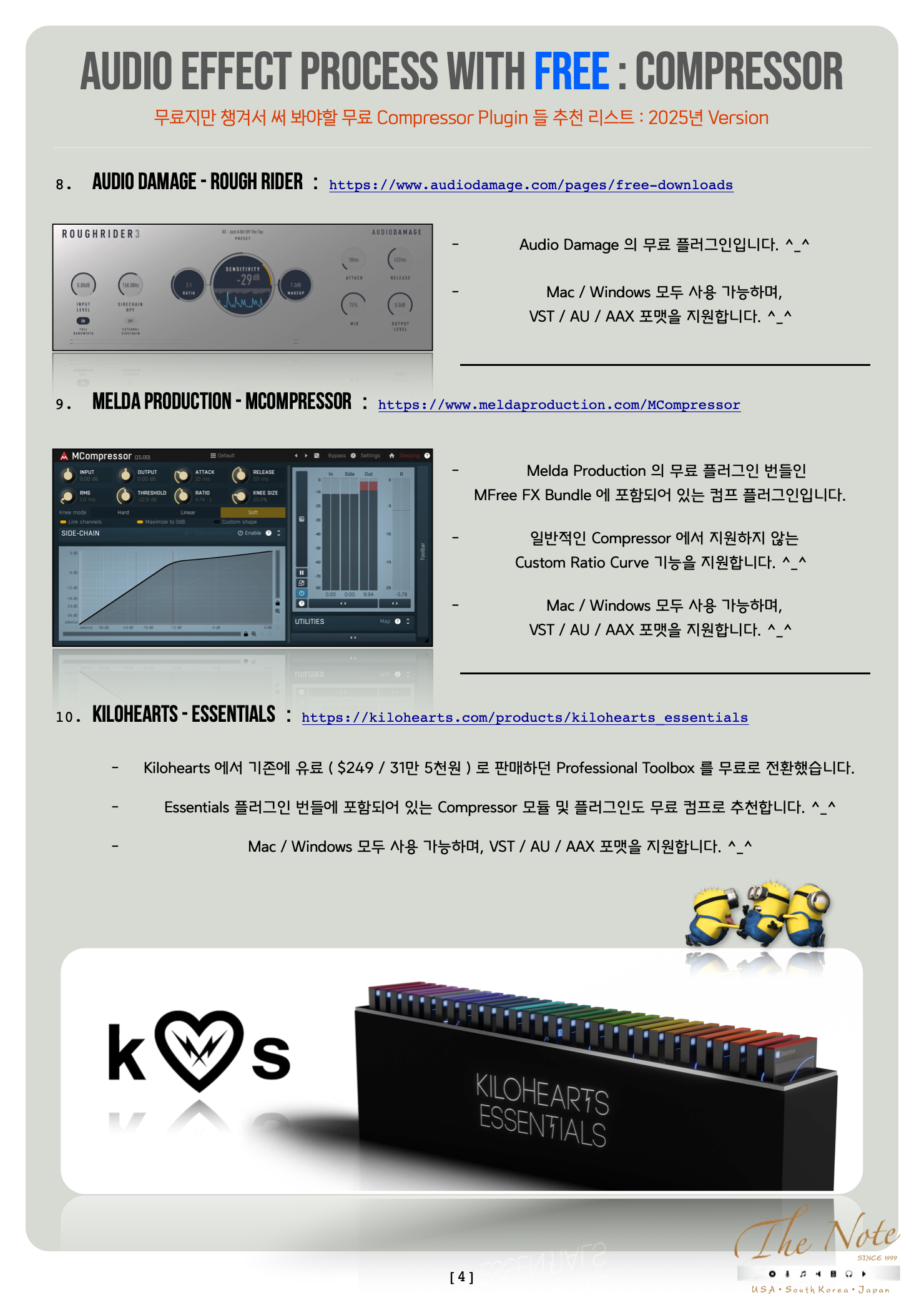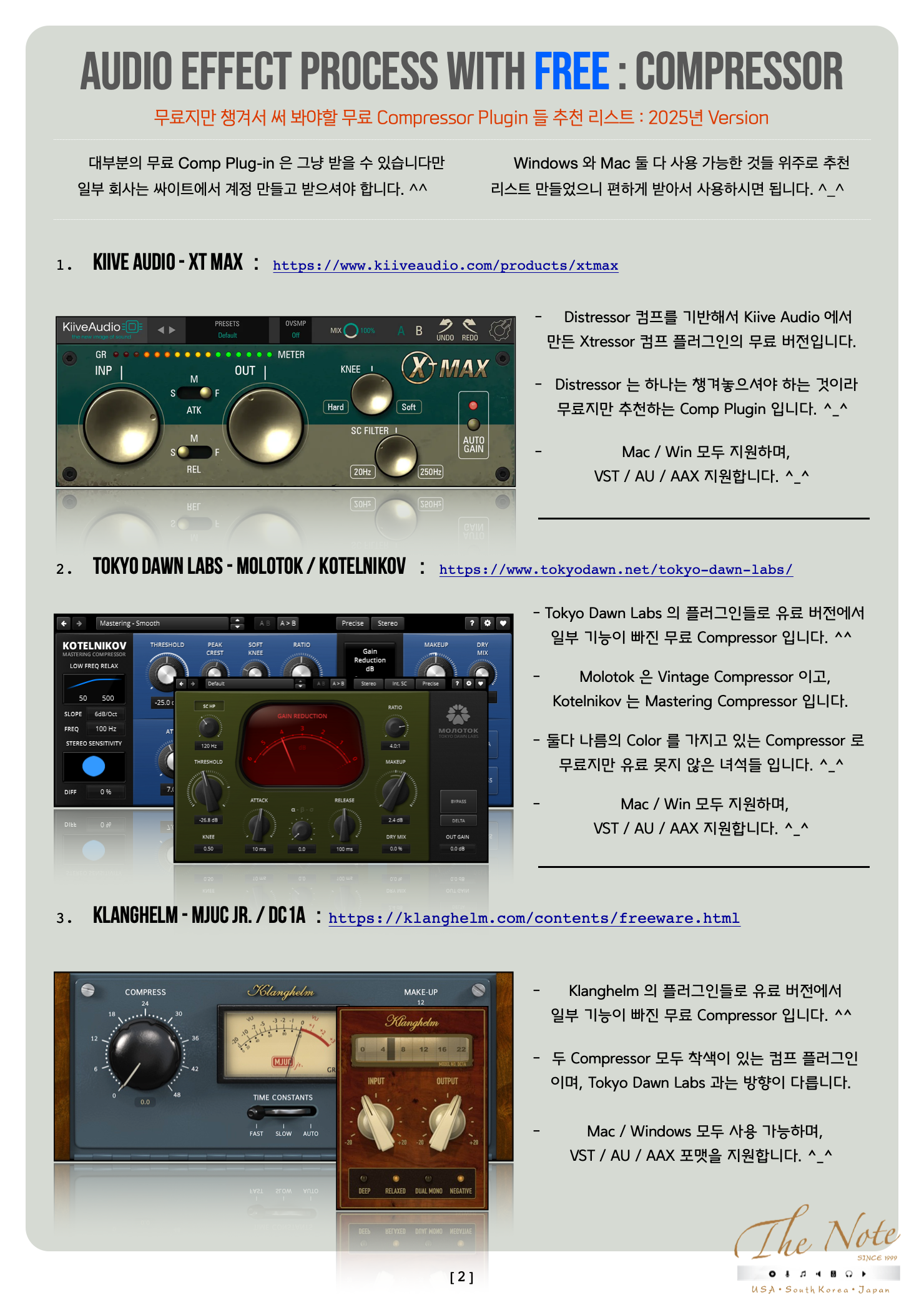 Audio Effect Process with Free Compressor 무료지만 챙겨두어야 할 무료 Compressor Download Guide : 2025 Audio Effect Process with FREE : Compressor 오늘은 무료지만 챙겨서 써 봐야할 무료 Compressor Plugin 들 추천 리스트를 정리해서 올려봅니다. ^_^ 기존에 유료 Comp 를 사용하는 분들도, 이제 새로 시작하는 분들도 꼭 한번 사용해보면 좋을 것들로 골랐습니다. ^^ 음악 작업을 하면서 여러가지 목적으로 Compressor 를 사용합니다. ^-^ 각각의 목적에 맞추기 위해선, Compressor Plugin 들도 그에 맞춰서 다양하게 가지고 있는 것이 필요합니다. ٩(の̀ᴗの́)و 하지만 그렇다고 용도에 따라서 유료 Plugin 을 여러개를 구매 하기에는 우리의 주머니가 가벼워질 수 있으니 이럴때 써 보시라고 무료지만 유료만큼이나 유용해서 챙겨서 써 봐야할 무료 Compressor Plugin 추천 리스트 를 올려봅니다. ^_^ 특히 일부 Compressor Plugin 은 무료라고 무시하시면 도리어 뒤통수 맞을 수도 있으니 꼭 한번 테스트 해보세요. ^_^ 추천 무료 Compressor Plugin 들 즐겁게 사용해보세요. ^_^ The Note 무료지만 챙겨서 써 봐야할 무료 Compressor Plugin 들 추천 리스트 : 2025년 Version 대부분의 무료 Comp Plug-in 은 그냥 받을 수 있습니다만 일부 회사는 싸이트에서 계정 만들고 받으셔야 합니다. ^^ Windows 와 Mac 둘 다 사용 가능한 것들 위주로 추천 리스트 만들었으니 편하게 받아서 사용하시면 됩니다. ^_^ Semantic Audio Labs - Compressor : http://www.semanticaudio.co.uk/ 영국의 Birmingham City University 와 Queen Mary University of London 의 SAFE Project 의 일환으로 만든 무료 플러그인입니다. ^_^ 무료지만 반드시 챙겨서 써 봐야 할 특별한 착색없는 Clean Comp 입니다. ^_^ Mac / Windows 모두 사용 가능하며, VST / AU 포맷을 지원합니다. ^_^ Tokyo Dawn Labs - Molotok / Kotelnikov : https://www.tokyodawn.net/tokyo-dawn-labs/ Tokyo Dawn Labs 의 플러그인들로 유료 버전에서 일부 기능이 빠진 무료 Compressor 입니다. ^^ Molotok 은 Vintage Compressor 이고, Kotelnikov 는 Mastering Compressor 입니다. 둘다 나름의 Color 를 가지고 있는 Compressor 로 무료지만 유료 못지 않은 녀석들 입니다. ^_^ Mac / Win 모두 지원하며, VST / AU / AAX 지원합니다. ^_^ klanghelm - MJUC jr. / DC1A : https://klanghelm.com/contents/freeware.html Klanghelm 의 플러그인들로 유료 버전에서 일부 기능이 빠진 무료 Compressor 입니다. ^^ 두 Compressor 모두 착색이 있는 컴프 플러그인 이며, Tokyo Dawn Labs 과는 방향이 다릅니다. Mac / Windows 모두 사용 가능하며, VST / AU / AAX 포맷을 지원합니다. ^_^ Acustica Audio - Free EQ Plugins : https://www.acustica-audio.com/store/t/acqua/free Acustica Audio 유료 플러그인들의 일부 파트를 따로 무료 플러그인으로 제공하고 있어서 이것도 추천합니다. ^^ TAN 은 SSL G Compressor 를 기반해서 만들어진 플러그인으로 무료 플러그인 ( Free Plugin ) 입니다. ^^ Mac / Windows 모두 사용 가능하며, AU / VST / AAX 포맷을 지원합니다. ^^ Native Instruments - Supercharger : https://www.native-instruments.com/en/products/komplete/effects/supercharger/ Native Instruments 의 Supercharger GT 에서 일부 기능이 빠진 무료 Compressor 입니다. ^_^ 진공관 ( Vacuum Tube ) Compressor 를 기반하고 있으며, 또 다른 착색이 있는 컴프 플러그인입니다. ^_^ Mac / Windows 모두 사용 가능하며, VST / AU / AAX 포맷을 지원합니다. ^_^ Jon v Audio - FirComp 2 : https://jonvaudio.gumroad.com/l/fircomp2 Jon V Audio 의 컴프레서 플러그인으로 무료 구매 가능합니다. 착색 전혀 없이 사용할 수 있는 Clean Comp 로 추천합니다. Mac / Windows 모두 사용 가능하며, VST / AU 포맷을 지원합니다. ^_^ Analog Obsession - Free EQ Plugins : https://www.patreon.com/analogobsession Analog Obsession 은 2020년 초부터 개발하는 전체 플러그인을 무료로 전환했습니다. ^_^ ( 후원하고 싶은 사람들을 위해서 Patreon 을 통해서 후원을 받고 있으니, 커피 한잔 후원하심을… ) 다양한 Compressor / Channel Strip 플러그인이 있습니다. Mac / Windows 모두 사용 가능하며, VST / AU 포맷을 지원합니다. ^_^ Audio Damage - Rough Rider : https://www.audiodamage.com/pages/free-downloads Audio Damage 의 무료 플러그인입니다. ^_^ Mac / Windows 모두 사용 가능하며, VST / AU / AAX 포맷을 지원합니다. ^_^ Melda Production - MCompressor : https://www.meldaproduction.com/MCompressor Melda Production 의 무료 플러그인 번들인 MFree FX Bundle 에 포함되어 있는 컴프 플러그인입니다. 일반적인 Compressor 에서 지원하지 않는 Custom Ratio Curve 기능을 지원합니다. ^_^ Mac / Windows 모두 사용 가능하며, VST / AU / AAX 포맷을 지원합니다. ^_^ kilohearts - Essentials : https://kilohearts.com/products/kilohearts_essentials Kilohearts 에서 기존에 유료 ( $249 / 31만 5천원 ) 로 판매하던 Professional Toolbox 를 무료로 전환했습니다. Essentials 플러그인 번들에 포함되어 있는 Compressor 모듈 및 플러그인도 무료 컴프로 추천합니다. ^_^ Mac / Windows 모두 사용 가능하며, VST / AU / AAX 포맷을 지원합니다. ^_^