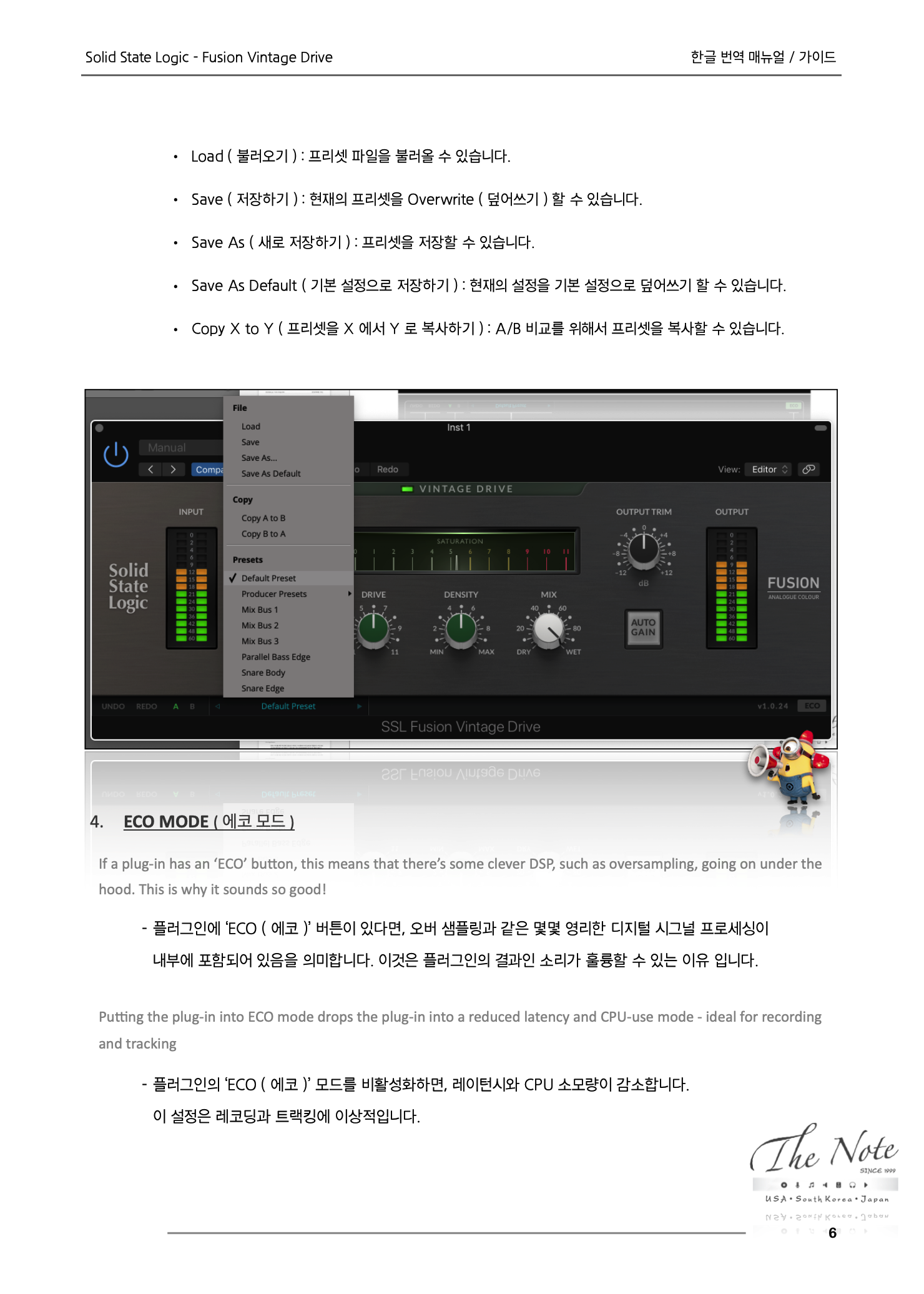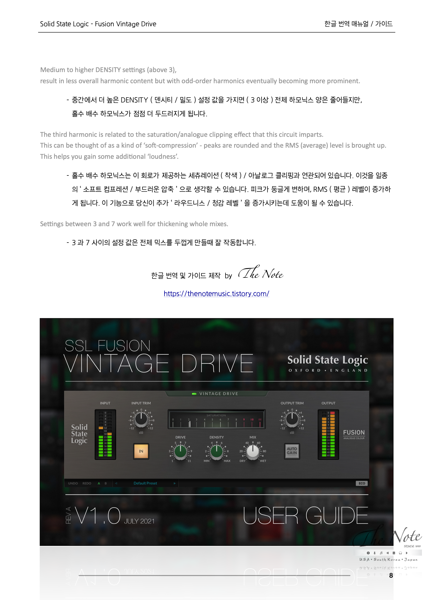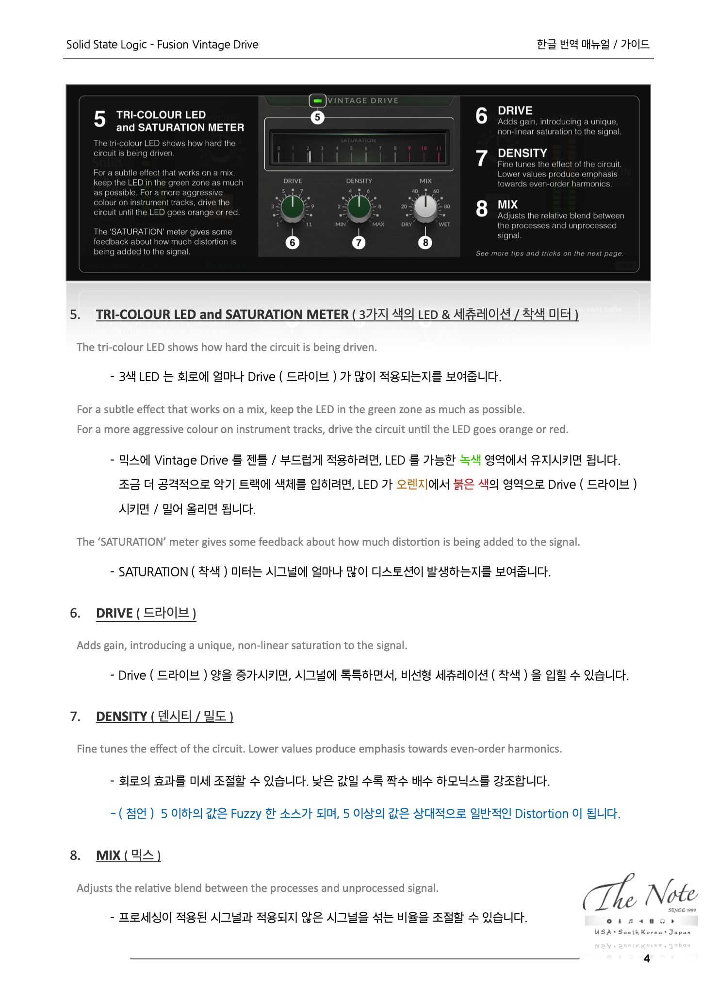 SSL : Fusion Vintage Drive Korean Manual for Fusion Vintage Drive by Solid State Logic Introduction ( 소개글 ) SSL FUSION Vintage Drive 플러그인은 SSL FUSION 의 비선형 세츄레이션 ( 착색 ) 회로를 DAW 에 가져와 아날로그 콘솔 느낌을 더해줍니다. WHAT IS SSL FUSION? SSL FUSION 이란 무엇인가요? SSL FUSION 은 아날로그 장비의 마스터인 SSL 에서 출시한 5가지 강력한 아날로그 세츄레이션 ( 착색 ) 도구를 제공하는 하드웨어 믹스 버스 프로세서입니다. ( 5가지 프로세서 : Vintage Drive, Violet EQ, HF Compressor, Stereo Image enhancer, SSL Transformer ) The 5 colors of SSL FUSION AKA the “Analogue Hit List“ ( SSL FUSION - 5가지 컬러 ) Vintage Drive : 아날로그 ‘ 스위트 스팟 ’ 에서 얻을 수 있는 추가 하모닉스와 완만한 세츄레이션 ( 착색 ) Fusion Vintage Drive - Controls ( Fusion Vintage Drive 파라미터 설명 ) I/O Meters ( 인풋 미터 / 아웃풋 미터 ) 인풋 / 아웃풋 미터링을 바 형태의 조각으로 표시하며, 피크 값은 3초의 피크 홀드 값으로 표시합니다. INPUT/OUTPUT TRIM ( 인풋 미터 / 아웃풋 트림 ) 인풋 / 아웃풋 시그널의 게인 값을 조절할 수 있습니다. BYPASS ( 바이패스 ) Fusion Vintage Drive 플러그인 프로세싱을 바이패스 / 비활성화합니다. ( 첨언 ) IN 버튼을 눌러서 바이패스를 하는 경우엔, Plugin Latency ( 플러그인 레이턴시 ) 는 유지하면서 _____ Fusion Vintage Drive 플러그인 프로세싱만 바이패스 / 비활성화됩니다. AUTO GAIN ( 오토 게인 ) DENSITY, DRIVE, INPUT TRIM 에 의해서 발생한 게인 변화량을 자동으로 보정 / 보상합니다. TRI-COLOUR LED and SATURATION METER ( 3가지 색의 LED & 세츄레이션 / 착색 미터 ) 3색 LED 는 회로에 얼마나 Drive ( 드라이브 ) 가 많이 적용되는지를 보여줍니다. 믹스에 Vintage Drive 를 젠틀 / 부드럽게 적용하려면, LED 를 가능한 녹색 영역에서 유지시키면 됩니다. 조금 더 공격적으로 악기 트랙에 색체를 입히려면, LED 가 오렌지에서 붉은 색의 영역으로 Drive ( 드라이브 ) 시키면 / 밀어 올리면 됩니다. SATURATION ( 착색 ) 미터는 시그널에 얼마나 많이 디스토션이 발생하는지를 보여줍니다. DRIVE ( 드라이브 ) Drive ( 드라이브 ) 양을 증가시키면, 시그널에 톡특하면서, 비선형 세츄레이션 ( 착색 ) 을 입힐 수 있습니다. DENSITY ( 덴시티 / 밀도 ) 회로의 효과를 미세 조절할 수 있습니다. 낮은 값일 수록 짝수 배수 하모닉스를 강조합니다. ( 첨언 ) 5 이하의 값은 Fuzzy 한 소스가 되며, 5 이상의 값은 상대적으로 일반적인 Distortion 이 됩니다. MIX ( 믹스 ) 프로세싱이 적용된 시그널과 적용되지 않은 시그널을 섞는 비율을 조절할 수 있습니다. THE SSL PLUG-IN ENGINE ( SSL 플러그인 엔진 - 파라미터 설명 ) UNDO / REDO ( 언두 / 리두 ) 실수를 되돌리거나, 또는 되돌린 것을 다시할 수 있습니다. 행복한 사고는 때로 훌륭한 결과로 이어집니다. A / B ( A / B 비교 ) 2개의 프리셋 사이에서 전환할 수 있습니다. 각기 다른 2개의 파라미터 설정을 비교하는데 유용합니다. PRESET MENU ( 프리셋 메뉴 ) 화살표 아이콘을 이용해서 프리셋들을 변경할 수 있습니다. 프리셋 메뉴를 열려면 클릭하면 됩니다. Load ( 불러오기 ) : 프리셋 파일을 불러올 수 있습니다. Save ( 저장하기 ) : 현재의 프리셋을 Overwrite ( 덮어쓰기 ) 할 수 있습니다. Save As ( 새로 저장하기 ) : 프리셋을 저장할 수 있습니다. Save As Default ( 기본 설정으로 저장하기 ) : 현재의 설정을 기본 설정으로 덮어쓰기 할 수 있습니다. Copy X to Y ( 프리셋을 X 에서 Y 로 복사하기 ) : A/B 비교를 위해서 프리셋을 복사할 수 있습니다. ECO MODE ( 에코 모드 ) 플러그인에 ‘ECO ( 에코 )’ 버튼이 있다면, 오버 샘플링과 같은 몇몇 영리한 디지털 시그널 프로세싱이 내부에 포함되어 있음을 의미합니다. 이것은 플러그인의 결과인 소리가 훌륭할 수 있는 이유 입니다. 플러그인의 ‘ECO ( 에코 )’ 모드를 비활성화하면, 레이턴시와 CPU 소모량이 감소합니다. 이 설정은 레코딩과 트랙킹에 이상적입니다. TIPS & TRICKS ( Fusion Vintage Drive - 팁 & 트릭 ) DRIVE 노브를 이용하여 회로 질감을 더 많이 입힐 수 있습니다. 1 은 가장 적은 양이고 11 은 가장 많은 양입니다. 3 색 LED 는 회로가 얼마나 많이 Drive ( 드라이브 ) 되었는지 / 얼마나 많은 착색이 발생하고 있는지 피드백을 제공합니다. 녹색에서부터 주황색 또는 빨간색까지 그 정도를 표시해줍니다. 하드웨어가 하는 것과 같이 말이죠! 플러그인에서, INPUT TRIM ( 인풋 트림 ) 컨트롤을 이용해서 더 강하게 착색을 입힐 수 있습니다! MIX + MASTER ( 믹스 + 마스터 ) 믹스에 Vintage Drive 를 젠틀 / 부드럽게 적용하려면, LED 를 가능한 녹색 영역에서 유지시키면 됩니다. ( 오렌지색이 빤짝거리는 것은 괜찮습니다. ) INDIVIDUAL STEMS ( 개별 스템 ) 조금 더 공격적으로 악기 트랙에 색체를 입히려면, LED 가 오렌지로 바뀌게 Drive ( 드라이브 ) 시키면 / 밀어 올리면 됩니다. 레드 영역에 있을 때, 믹스 버스에서는 바람직하지 않지만, 개별 스템에서는 잘 작동하는 매우 / 꽤 분명한 세츄레이션 ( 착색 ) 을 확인할 수 있습니다. DENSITY ( 덴시티 / 밀도 ) 낮은 DENSITY ( 덴시티 / 밀도 ) 값일 수록 더 많은 짝수 배수 하모닉스를 만들어냅니다. 2 ~ 3 사이 값으로 설정하면 믹스에 Richness ( 풍부함 ) 을 더해줄 수 있습니다. 중간에