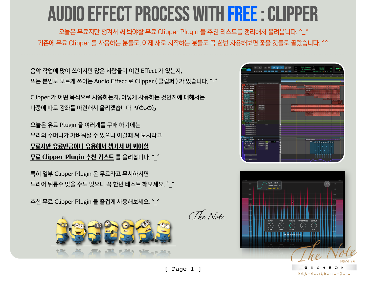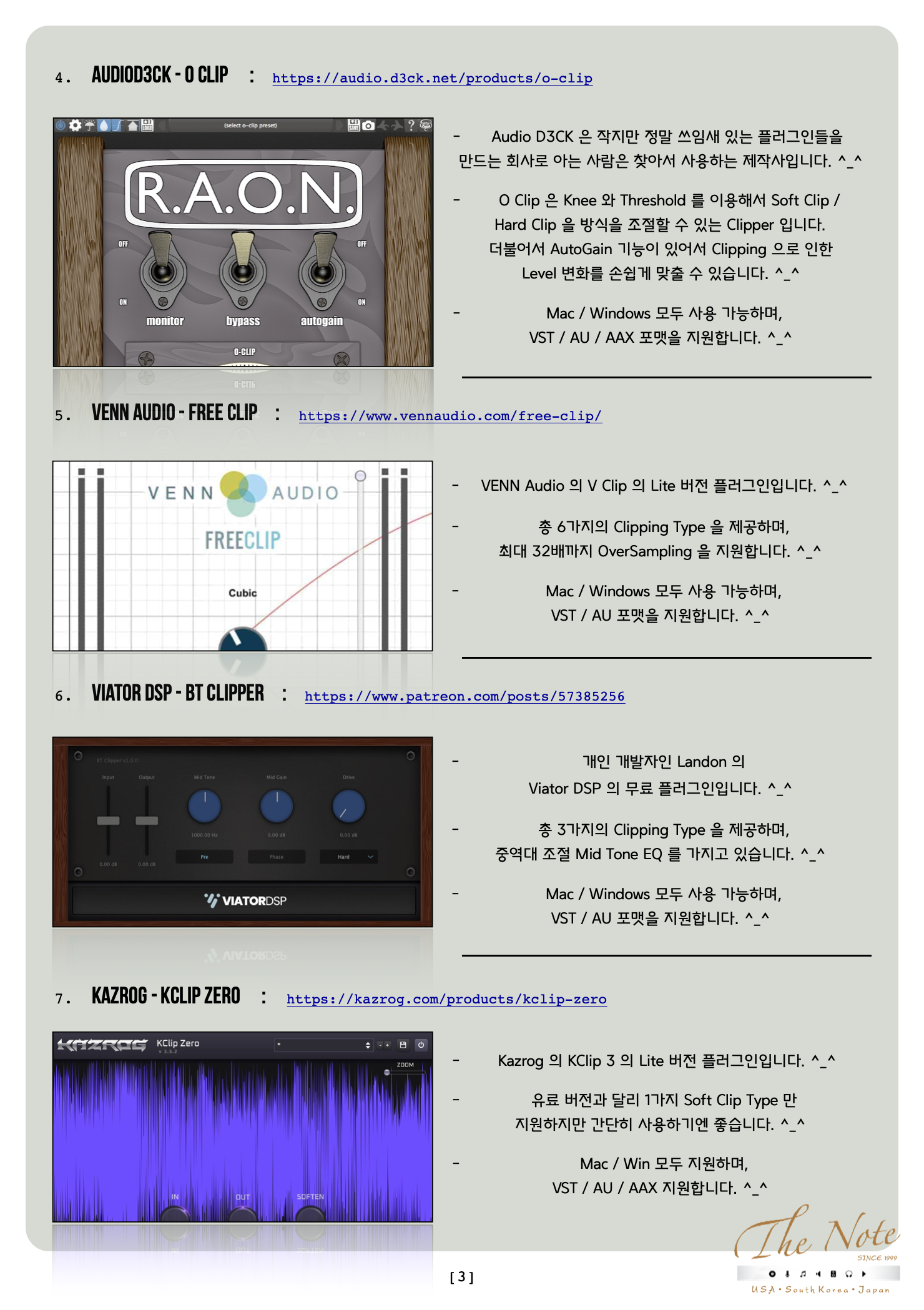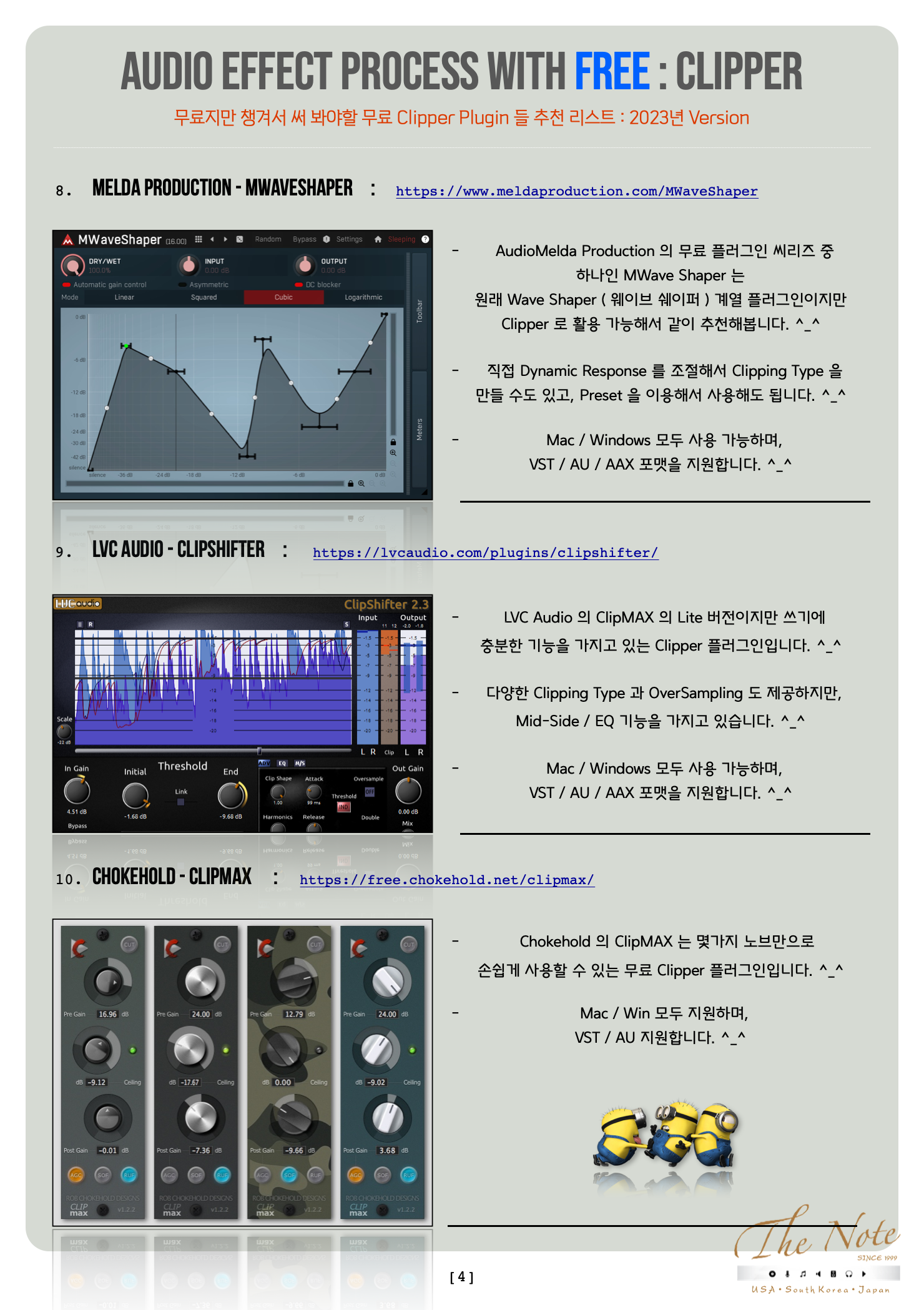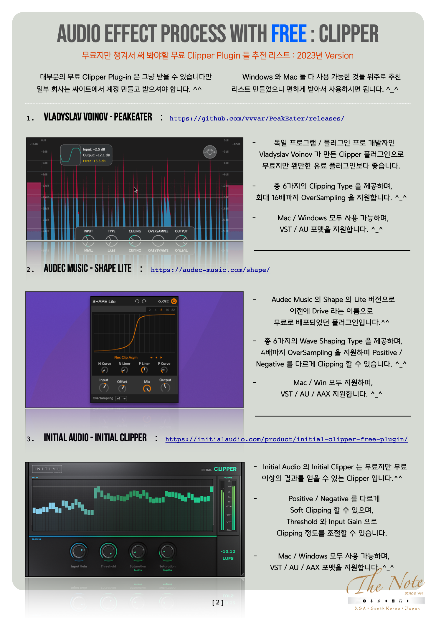 Audio Effect Process with Free Clipper 무료지만 챙겨두어야 할 무료 Clipper Download Guide : 2023 Audio Effect Process with FREE : Clipper 오늘은 무료지만 챙겨서 써 봐야할 무료 Clipper Plugin 들 추천 리스트를 정리해서 올려봅니다. ^_^ 기존에 유료 Clipper 를 사용하는 분들도, 이제 새로 시작하는 분들도 꼭 한번 사용해보면 좋을 것들로 골랐습니다. ^^ 음악 작업에 많이 쓰이지만 많은 사람들이 이런 Effect 가 있는지, 또는 본인도 모르게 쓰이는 Audio Effect 로 Clipper ( 클립퍼 ) 가 있습니다. ^-^ Clipper 가 어떤 목적으로 사용하는지, 어떻게 사용하는 것인지에 대해서는 나중에 따로 강좌를 마련해서 올리겠습니다. ٩(の̀ᴗの́)و 오늘은 유료 Plugin 을 여러개를 구매 하기에는 우리의 주머니가 가벼워질 수 있으니 이럴때 써 보시라고 무료지만 유료만큼이나 유용해서 챙겨서 써 봐야할 무료 Clipper Plugin 추천 리스트 를 올려봅니다. ^_^ 특히 일부 Clipper Plugin 은 무료라고 무시하시면 도리어 뒤통수 맞을 수도 있으니 꼭 한번 테스트 해보세요. ^_^ 추천 무료 Clipper Plugin 들 즐겁게 사용해보세요. ^_^ The Note 무료지만 챙겨서 써 봐야할 무료 Clipper Plugin 들 추천 리스트 : 2023년 Version 대부분의 무료 Clipper Plug-in 은 그냥 받을 수 있습니다만 일부 회사는 싸이트에서 계정 만들고 받으셔야 합니다. ^^ Windows 와 Mac 둘 다 사용 가능한 것들 위주로 추천 리스트 만들었으니 편하게 받아서 사용하시면 됩니다. ^_^ Vladyslav Voinov - PeakEater : https://github.com/vvvar/PeakEater/releases/ 독일 프로그램 / 플러그인 프로 개발자인 Vladyslav Voinov 가 만든 Clipper 플러그인으로 무료지만 왠만한 유료 플러그인보다 좋습니다. 총 6가지의 Clipping Type 을 제공하며, 최대 16배까지 OverSampling 을 지원합니다. ^_^ Mac / Windows 모두 사용 가능하며, VST / AU 포맷을 지원합니다. ^_^ Audec Music - Shape Lite : https://audec-music.com/shape/ Audec Music 의 Shape 의 Lite 버전으로 이전에 Drive 라는 이름으로 무료로 배포되었던 플러그인입니다.^^ 총 6가지의 Wave Shaping Type 을 제공하며, 4배까지 OverSampling 을 지원하며 Positive / Negative 를 다르게 Clipping 할 수 있습니다. ^_^ Mac / Win 모두 지원하며, VST / AU / AAX 지원합니다. ^_^ Initial Audio - Initial Clipper : https://initialaudio.com/product/initial-clipper-free-plugin/ Initial Audio 의 Initial Clipper 는 무료지만 무료 이상의 결과를 얻을 수 있는 Clipper 입니다.^^ Positive / Negative 를 다르게 Soft Clipping 할 수 있으며, Threshold 와 Input Gain 으로 Clipping 정도를 조절할 수 있습니다. Mac / Windows 모두 사용 가능하며, VST / AU / AAX 포맷을 지원합니다. ^_^ audioD3CK - o clip : https://audio.d3ck.net/products/o-clip Audio D3CK 은 작지만 정말 쓰임새 있는 플러그인들을 만드는 회사로 아는 사람은 찾아서 사용하는 제작사입니다. ^_^ O Clip 은 Knee 와 Threshold 를 이용해서 Soft Clip / Hard Clip 을 방식을 조절할 수 있는 Clipper 입니다. 더불어서 AutoGain 기능이 있어서 Clipping 으로 인한 Level 변화를 손쉽게 맞출 수 있습니다. ^_^ Mac / Windows 모두 사용 가능하며, VST / AU / AAX 포맷을 지원합니다. ^_^ Venn Audio - Free Clip : https://www.vennaudio.com/free-clip/ VENN Audio 의 V Clip 의 Lite 버전 플러그인입니다. ^_^ 총 6가지의 Clipping Type 을 제공하며, 최대 32배까지 OverSampling 을 지원합니다. ^_^ Mac / Windows 모두 사용 가능하며, VST / AU 포맷을 지원합니다. ^_^ Viator DSP - BT Clipper : https://www.patreon.com/posts/57385256 개인 개발자인 Landon 의 Viator DSP 의 무료 플러그인입니다. ^_^ 총 3가지의 Clipping Type 을 제공하며, 중역대 조절 Mid Tone EQ 를 가지고 있습니다. ^_^ Mac / Windows 모두 사용 가능하며, VST / AU 포맷을 지원합니다. ^_^ Kazrog - KClip Zero : https://kazrog.com/products/kclip-zero Kazrog 의 KClip 3 의 Lite 버전 플러그인입니다. ^_^ 유료 버전과 달리 1가지 Soft Clip Type 만 지원하지만 간단히 사용하기엔 좋습니다. ^_^ Mac / Win 모두 지원하며, VST / AU / AAX 지원합니다. ^_^ Melda Production - MWaveShaper : https://www.meldaproduction.com/MWaveShaper AudioMelda Production 의 무료 플러그인 씨리즈 중 하나인 MWave Shaper 는 원래 Wave Shaper ( 웨이브 쉐이퍼 ) 계열 플러그인이지만 Clipper 로 활용 가능해서 같이 추천해봅니다. ^_^ 직접 Dynamic Response 를 조절해서 Clipping Type 을 만들 수도 있고, Preset 을 이용해서 사용해도 됩니다. ^_^ Mac / Windows 모두 사용 가능하며, VST / AU / AAX 포맷을 지원합니다. ^_^ LVC Audio - ClipShifter : https://lvcaudio.com/plugins/clipshifter/ LVC Audio 의 ClipMAX 의 Lite 버전이지만 쓰기에 충분한 기능을 가지고 있는 Clipper 플러그인입니다. ^_^ 다양한 Clipping Type 과 OverSampling 도 제공하지만, Mid-Side / EQ 기능을 가지고 있습니다. ^_^ Mac / Windows 모두 사용 가능하며, VST / AU / AAX 포맷을 지원합니다. ^_^ Chokehold - Clipmax : https://free.chokehold.net/clipmax/ Chokehold 의 ClipMAX 는 몇가지 노브만으로 손쉽게 사용할 수 있는 무료 Clipper 플러그인입니다. ^_^ Mac / Win 모두 지원하며, VST / AU 지원합니다. ^_^