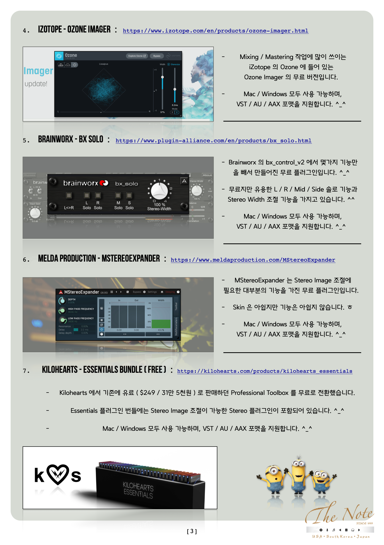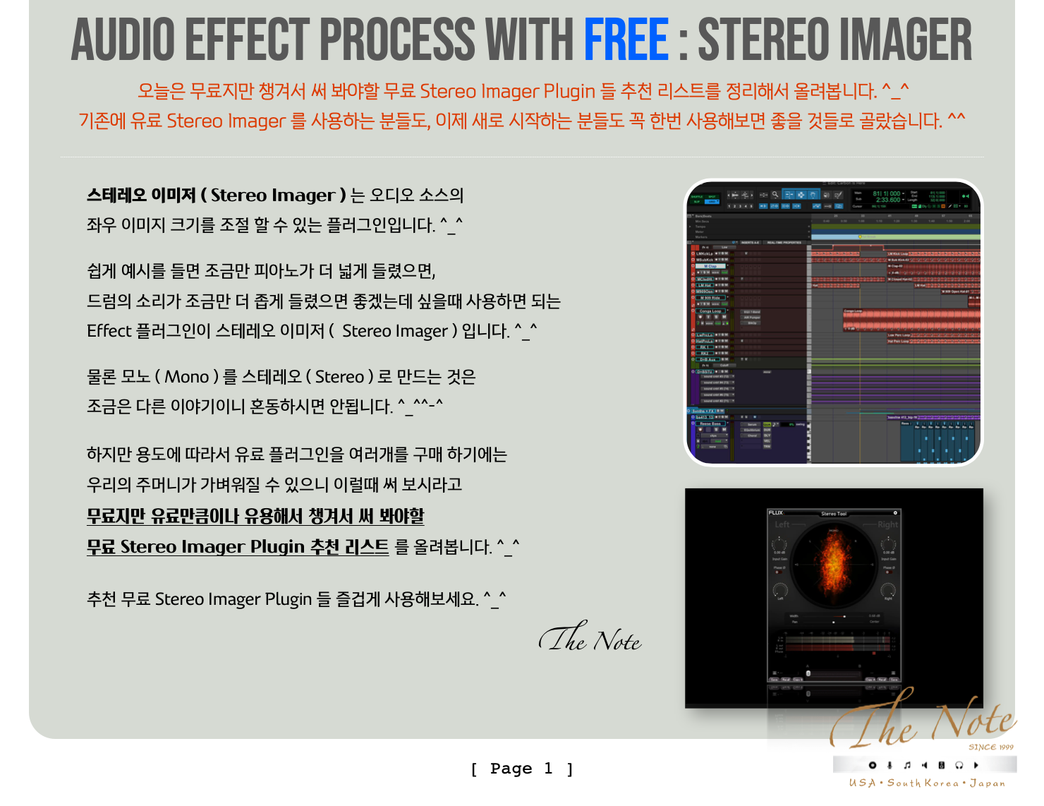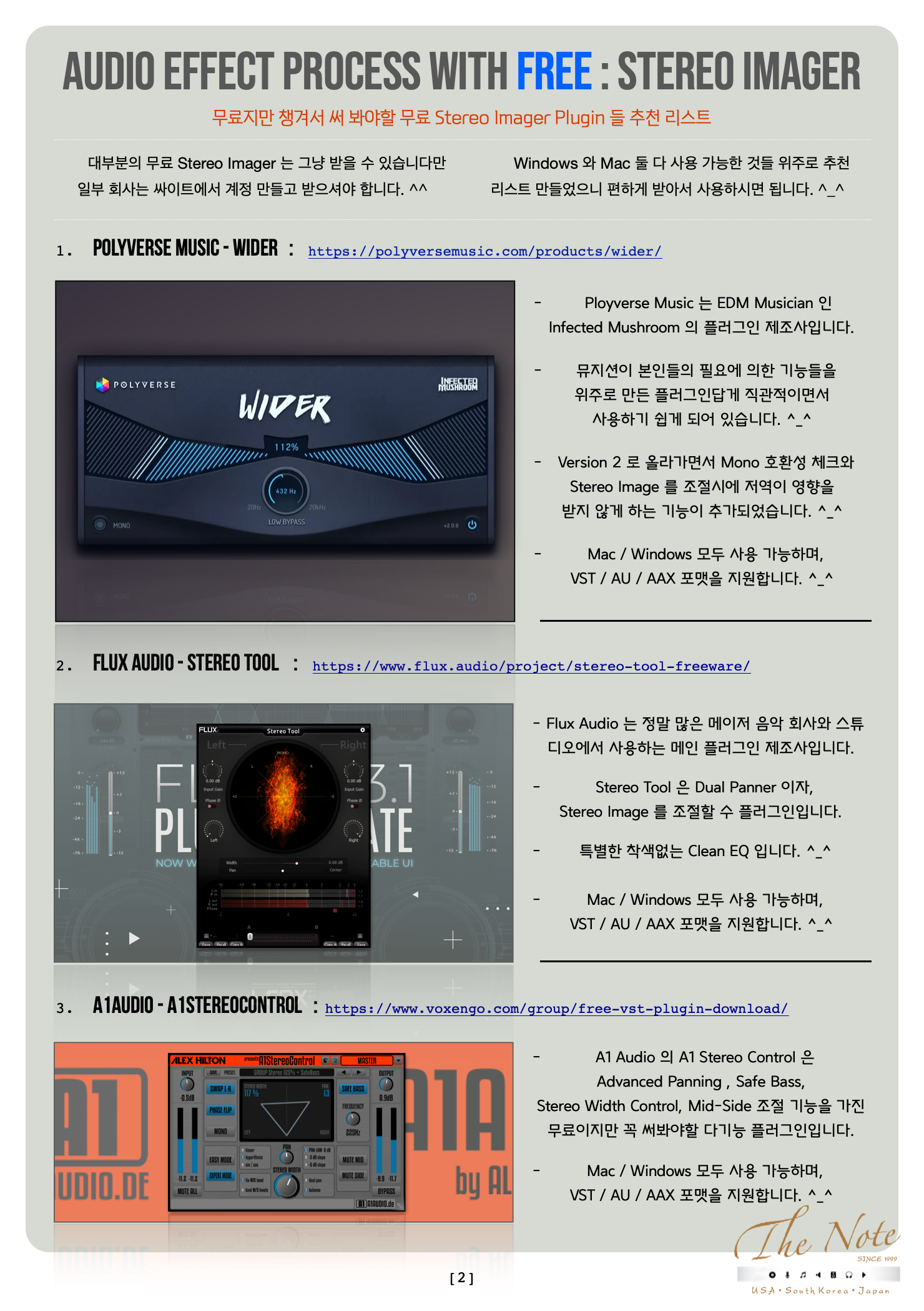 Audio Effect Process with Free Stereo Imager 무료지만 챙겨두어야 할 무료 Stereo Imager Download Guide : 2023 Audio Effect Process with FREE : Stereo Imager 오늘은 무료지만 챙겨서 써 봐야할 무료 Stereo Imager Plugin 들 추천 리스트를 정리해서 올려봅니다. ^_^ 기존에 유료 Stereo Imager 를 사용하는 분들도, 이제 새로 시작하는 분들도 꼭 한번 사용해보면 좋을 것들로 골랐습니다. ^^ 스테레오 이미저 ( Stereo Imager ) 는 오디오 소스의 좌우 이미지 크기를 조절 할 수 있는 플러그인입니다. ^_^ 쉽게 예시를 들면 조금만 피아노가 더 넓게 들렸으면, 드럼의 소리가 조금만 더 좁게 들렸으면 좋겠는데 싶을때 사용하면 되는 Effect 플러그인이 스테레오 이미저 ( Stereo Imager ) 입니다. ^_^ 물론 모노 ( Mono ) 를 스테레오 ( Stereo ) 로 만드는 것은 조금은 다른 이야기이니 혼동하시면 안됩니다. ^_^^-^ 하지만 용도에 따라서 유료 플러그인을 여러개를 구매 하기에는 우리의 주머니가 가벼워질 수 있으니 이럴때 써 보시라고 무료지만 유료만큼이나 유용해서 챙겨서 써 봐야할 무료 Stereo Imager Plugin 추천 리스트 를 올려봅니다. ^_^ 추천 무료 Stereo Imager Plugin 들 즐겁게 사용해보세요. ^_^ The Note 대부분의 무료 Stereo Imager 는 그냥 받을 수 있습니다만 일부 회사는 싸이트에서 계정 만들고 받으셔야 합니다. ^^ Windows 와 Mac 둘 다 사용 가능한 것들 위주로 추천 리스트 만들었으니 편하게 받아서 사용하시면 됩니다. ^_^ Polyverse Music - Wider : https://polyversemusic.com/products/wider/ Ployverse Music 는 EDM Musician 인 Infected Mushroom 의 플러그인 제조사입니다. 뮤지션이 본인들의 필요에 의한 기능들을 위주로 만든 플러그인답게 직관적이면서 사용하기 쉽게 되어 있습니다. ^_^ Version 2 로 올라가면서 Mono 호환성 체크와 Stereo Image 를 조절시에 저역이 영향을 받지 않게 하는 기능이 추가되었습니다. ^_^ Mac / Windows 모두 사용 가능하며, VST / AU / AAX 포맷을 지원합니다. ^_^ Flux Audio - Stereo Tool : https://www.flux.audio/project/stereo-tool-freeware/ Flux Audio 는 정말 많은 메이저 음악 회사와 스튜디오에서 사용하는 메인 플러그인 제조사입니다. Stereo Tool 은 Dual Panner 이자, Stereo Image 를 조절할 수 플러그인입니다. 특별한 착색없는 Clean EQ 입니다. ^_^ Mac / Windows 모두 사용 가능하며, VST / AU / AAX 포맷을 지원합니다. ^_^ A1audio - A1StereoControl : https://www.voxengo.com/group/free-vst-plugin-download/ A1 Audio 의 A1 Stereo Control 은 Advanced Panning , Safe Bass, Stereo Width Control, Mid-Side 조절 기능을 가진 무료이지만 꼭 써봐야할 다기능 플러그인입니다. Mac / Windows 모두 사용 가능하며, VST / AU / AAX 포맷을 지원합니다. ^_^ iZotope - Ozone Imager : https://www.izotope.com/en/products/ozone-imager.html Mixing / Mastering 작업에 많이 쓰이는 iZotope 의 Ozone 에 들어 있는 Ozone Imager 의 무료 버전입니다. Mac / Windows 모두 사용 가능하며, VST / AU / AAX 포맷을 지원합니다. ^_^ Brainworx - bx solo : https://www.plugin-alliance.com/en/products/bx_solo.html Brainworx 의 bx_control_v2 에서 몇가지 기능만을 빼서 만들어진 무료 플러그인입니다. ^_^ 무료지만 유용한 L / R / Mid / Side 솔로 기능과 Stereo Width 조절 기능을 가지고 있습니다. ^^ Mac / Windows 모두 사용 가능하며, VST / AU / AAX 포맷을 지원합니다. ^_^ Melda Production - MStereoExpander : https://www.meldaproduction.com/MStereoExpander MStereoExpander 는 Stereo Image 조절에 필요한 대부분의 기능을 가진 무료 플러그인입니다. Skin 은 아쉽지만 기능은 아쉽지 않습니다. ㅎ Mac / Windows 모두 사용 가능하며, VST / AU / AAX 포맷을 지원합니다. ^_^ Kilohearts - Essentials Bundle ( Free ) : https://kilohearts.com/products/kilohearts_essentials Kilohearts 에서 기존에 유료 ( $249 / 31만 5천원 ) 로 판매하던 Professional Toolbox 를 무료로 전환했습니다. Essentials 플러그인 번들에는 Stereo Image 조절이 가능한 Stereo 플러그인이 포함되어 있습니다. ^_^ Mac / Windows 모두 사용 가능하며, VST / AU / AAX 포맷을 지원합니다. ^_^