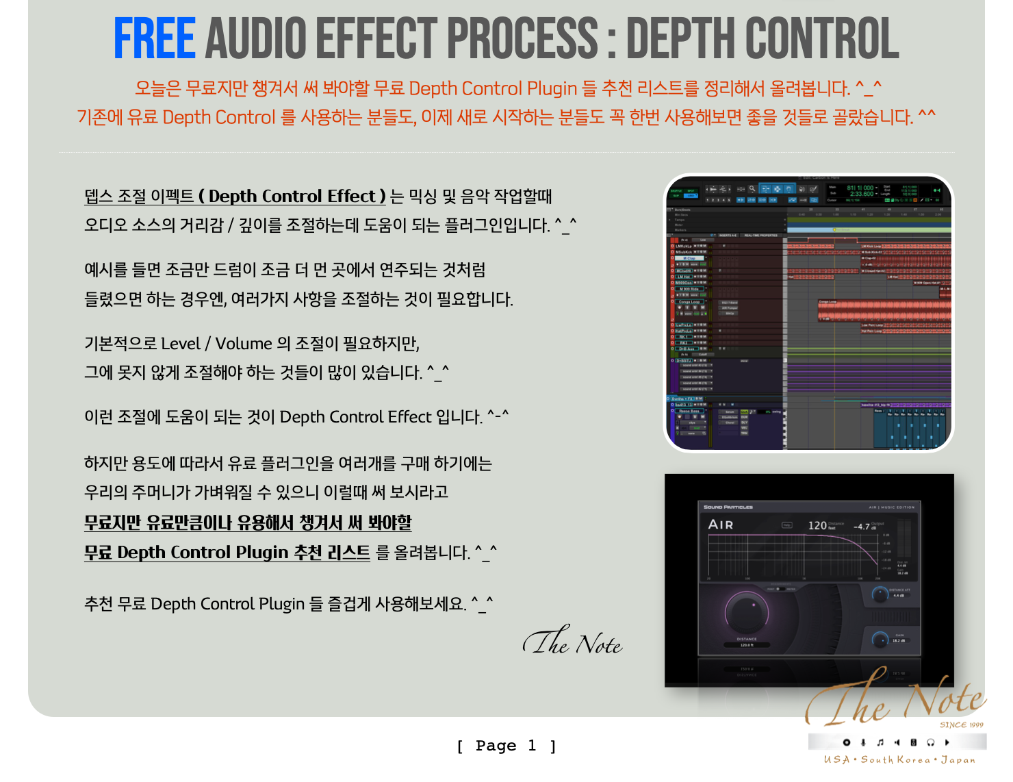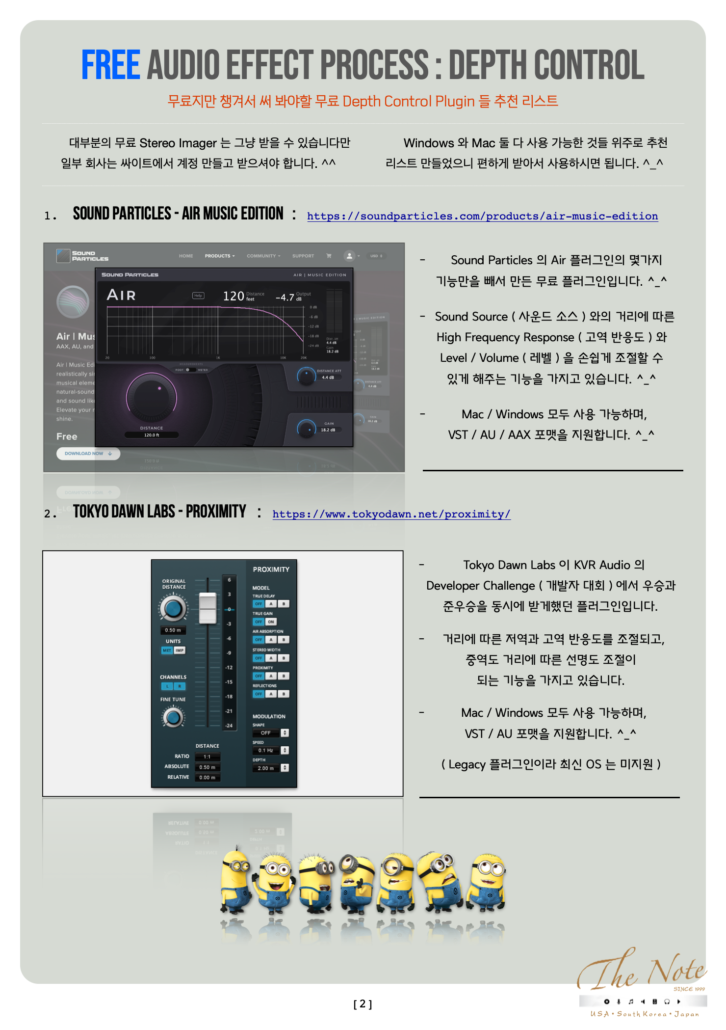 Free Audio Effect Process for Depth Control 무료지만 챙겨두어야 할 무료 Depth Control Plugin Guide : 2023 FREE Audio Effect Process : Depth Control 오늘은 무료지만 챙겨서 써 봐야할 무료 Depth Control Plugin 들 추천 리스트를 정리해서 올려봅니다. ^_^ 기존에 유료 Depth Control 를 사용하는 분들도, 이제 새로 시작하는 분들도 꼭 한번 사용해보면 좋을 것들로 골랐습니다. ^^ 뎁스 조절 이펙트 ( Depth Control Effect ) 는 믹싱 및 음악 작업할때 오디오 소스의 거리감 / 깊이를 조절하는데 도움이 되는 플러그인입니다. ^_^ 예시를 들면 조금만 드럼이 조금 더 먼 곳에서 연주되는 것처럼 들렸으면 하는 경우엔, 여러가지 사항을 조절하는 것이 필요합니다. 기본적으로 Level / Volume 의 조절이 필요하지만, 그에 못지 않게 조절해야 하는 것들이 많이 있습니다. ^_^ 이런 조절에 도움이 되는 것이 Depth Control Effect 입니다. ^-^ 하지만 용도에 따라서 유료 플러그인을 여러개를 구매 하기에는 우리의 주머니가 가벼워질 수 있으니 이럴때 써 보시라고 무료지만 유료만큼이나 유용해서 챙겨서 써 봐야할 무료 Depth Control Plugin 추천 리스트 를 올려봅니다. ^_^ 추천 무료 Depth Control Plugin 들 즐겁게 사용해보세요. ^_^ The Note 무료지만 챙겨서 써 봐야할 무료 Depth Control Plugin 들 추천 리스트 대부분의 무료 Stereo Imager 는 그냥 받을 수 있습니다만 일부 회사는 싸이트에서 계정 만들고 받으셔야 합니다. ^^ Windows 와 Mac 둘 다 사용 가능한 것들 위주로 추천 리스트 만들었으니 편하게 받아서 사용하시면 됩니다. ^_^ Sound Particles - Air Music Edition : https://soundparticles.com/products/air-music-edition Sound Particles 의 Air 플러그인의 몇가지 기능만을 빼서 만든 무료 플러그인입니다. ^_^ Sound Source ( 사운드 소스 ) 와의 거리에 따른 High Frequency Response ( 고역 반응도 ) 와 Level / Volume ( 레벨 ) 을 손쉽게 조절할 수 있게 해주는 기능을 가지고 있습니다. ^_^ Mac / Windows 모두 사용 가능하며, VST / AU / AAX 포맷을 지원합니다. ^_^ Tokyo Dawn Labs - Proximity : https://www.tokyodawn.net/proximity/ Tokyo Dawn Labs 이 KVR Audio 의 Developer Challenge ( 개발자 대회 ) 에서 우승과 준우승을 동시에 받게했던 플러그인입니다. 거리에 따른 저역과 고역 반응도를 조절되고, 중역도 거리에 따른 선명도 조절이 되는 기능을 가지고 있습니다. Mac / Windows 모두 사용 가능하며, VST / AU 포맷을 지원합니다. ^_^ ( Legacy 플러그인이라 최신 OS 는 미지원 )