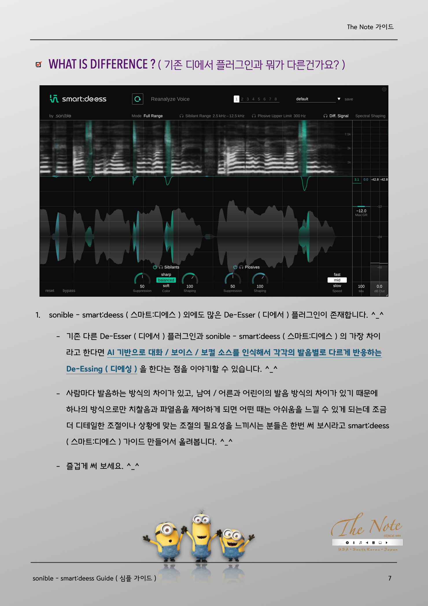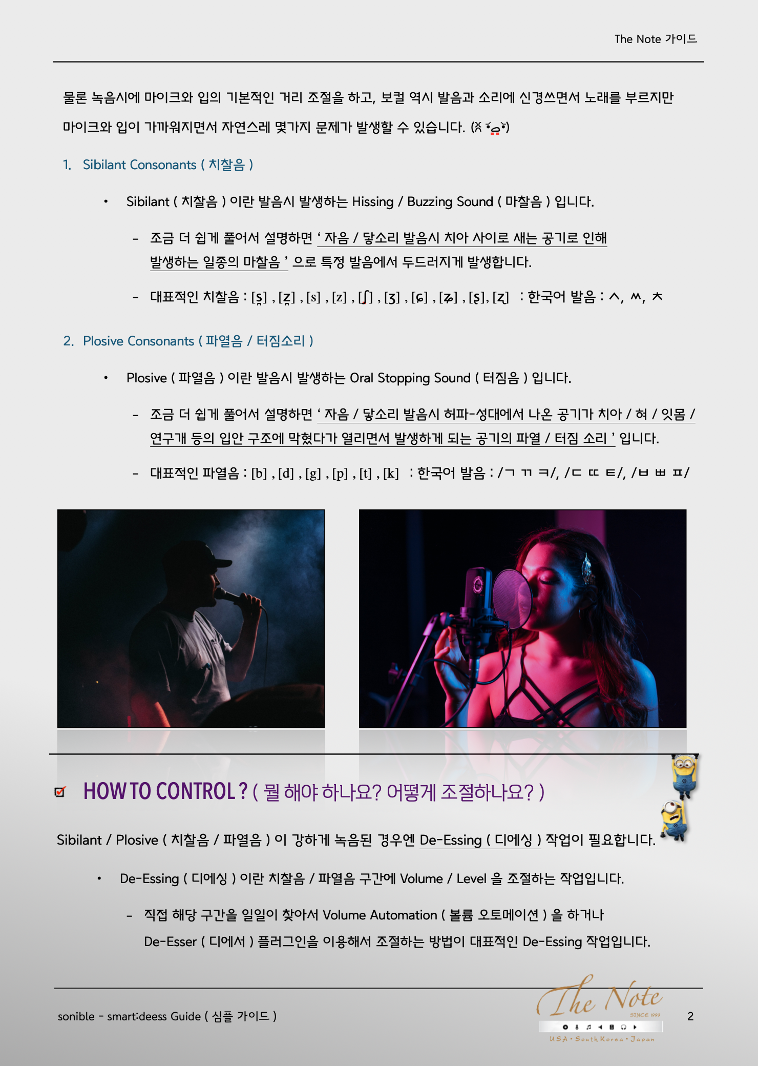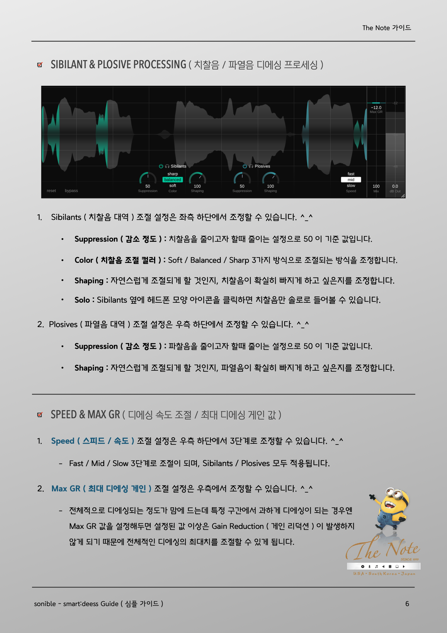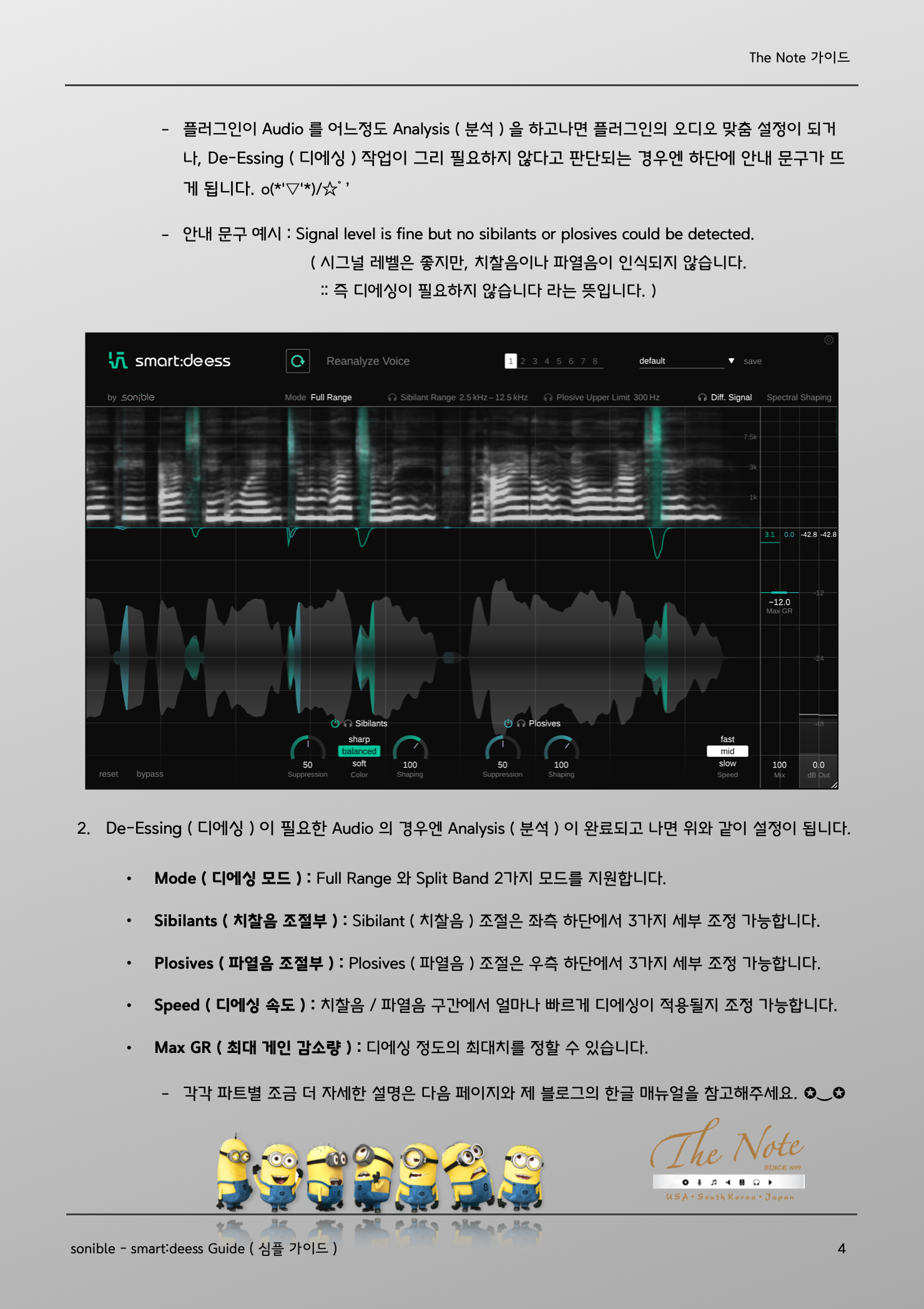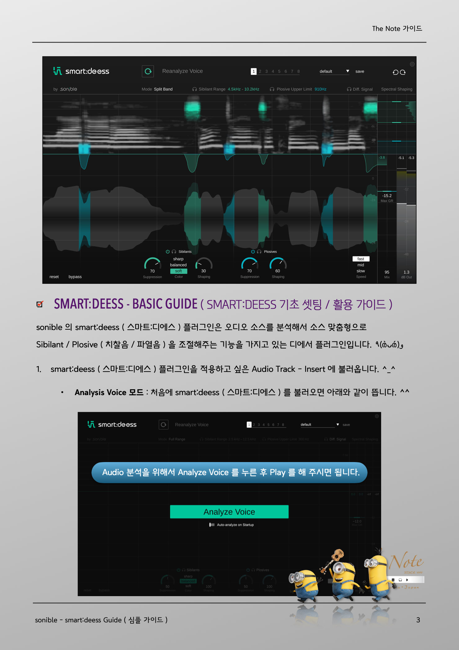The Note 가이드 smart : deess Guide sonible - smart:deess senible 에서 소스 맞춤형으로 작동하는 De-Esser ( 디에서 ) 플러그인인 smart:deess 를 출시해서 활용하는데 도움될 강좌 / 가이드 올려봅니다. ✪‿✪ 이번 가이드에는 De-Esser ( 디에서 ) 에 대한 기본적인 강좌 내용을 포함하고 있습니다. ٩(ˊᗜˋ*)و Some issue with Recording ( 녹음시에 발생하는 몇가지 이슈 ) 평소에 우리가 사람들과 대화를 나눌때와 녹음해서 목소리를 들을 때에는 큰 차이 하나가 있습니다. ٩( *˙0˙*)۶ 마이크를 사용해서 녹음하는 것과 대화의 근본적인 차이는 [ 입과 귀의 거리 차이 ] 입니다. 일반적으로 대화를 하는 상황에서는 자연스레 말하는 사람과 듣는 사람의 거리가 적당히 떨어져 있는 것에 반해서 녹음 상황에서는 마이크와 입의 거리가 상대적으로 더 가깝습니다. 즉 입과 귀에 해당하는 마이크 거리가 다릅니다. 물론 녹음시에 마이크와 입의 기본적인 거리 조절을 하고, 보컬 역시 발음과 소리에 신경쓰면서 노래를 부르지만 마이크와 입이 가까워지면서 자연스레 몇가지 문제가 발생할 수 있습니다. (ꐦ •᷄ࡇ•᷅) Sibilant Consonants ( 치찰음 ) Sibilant ( 치찰음 ) 이란 발음시 발생하는 Hissing / Buzzing Sound ( 마찰음 ) 입니다. 조금 더 쉽게 풀어서 설명하면 ‘ 자음 / 닿소리 발음시 치아 사이로 새는 공기로 인해 발생하는 일종의 마찰음 ’ 으로 특정 발음에서 두들어지게 발생합니다. 대표적인 치찰음 : [s̪] , [z̪] , [s] , [z] , [ʃ] , [ʒ] , [ɕ] , [ʑ] , [ʂ], [ʐ] : 한국어 발음 : ㅅ, ㅆ, ㅊ Plosive Consonants ( 파열음 / 터짐소리 ) Plosive ( 파열음 ) 이란 발음시 발생하는 Oral Stopping Sound ( 터짐음 ) 입니다. 조금 더 쉽게 풀어서 설명하면 ‘ 자음 / 닿소리 발음시 허파-성대에서 나온 공기가 치아 / 혀 / 잇몸 /연구개 등의 입안 구조에 막혔다가 열리면서 발생하게 되는 공기의 파열 / 터짐 소리 ’ 입니다. 대표적인 파열음 : [b] , [d] , [g] , [p] , [t] , [k] : 한국어 발음 : /ㄱ ㄲ ㅋ/, /ㄷ ㄸ ㅌ/, /ㅂ ㅃ ㅍ/ How to Control ? ( 뭘 해야 하나요? 어떻게 조절하나요? ) Sibilant / Plosive ( 치찰음 / 파열음 ) 이 강하게 녹음된 경우엔 De-Essing ( 디에싱 ) 작업이 필요합니다. De-Essing ( 디에싱 ) 이란 치찰음 / 파열음 구간에 Volume / Level 을 조절하는 작업입니다. 직접 해당 구간을 일일이 찾아서 Volume Automation ( 볼륨 오토메이션 ) 을 하거나 De-Esser ( 디에서 ) 플러그인을 이용해서 조절하는 방법이 대표적인 De-Essing 작업입니다. smart:deess - Basic Guide ( smart:Deess 기초 셋팅 / 활용 가이드 ) sonible 의 smart:deess ( 스마트:디에스 ) 플러그인은 오디오 소스를 분석해서 소스 맞춤형으로 Sibilant / Plosive ( 치찰음 / 파열음 ) 을 조절해주는 기능을 가지고 있는 디에서 플러그인입니다. ٩(ര̀ᴗര́)و smart:deess ( 스마트:디에스 ) 플러그인을 적용하고 싶은 Audio Track - Insert 에 불러옵니다. ^_^ Analysis Voice 모드 : 처음에 smart:deess ( 스마트:디에스 ) 를 불러오면 아래와 같이 뜹니다. ^^ 플러그인이 Audio 를 어느정도 Analysis ( 분석 ) 을 하고나면 플러그인의 오디오 맞춤 설정이 되거나, De-Essing ( 디에싱 ) 작업이 그리 필요하지 않다고 판단되는 경우엔 하단에 안내 문구가 뜨게 됩니다. o(*'▽'*)/☆゚’ 안내 문구 예시 : Signal level is fine but no sibilants or plosives could be detected. ( 시그널 레벨은 좋지만, 치찰음이나 파열음이 인식되지 않습니다. :: 즉 디에싱이 필요하지 않습니다 라는 뜻입니다. ) De-Essing ( 디에싱 ) 이 필요한 Audio 의 경우엔 Analysis ( 분석 ) 이 완료되고 나면 위와 같이 설정이 됩니다. Mode ( 디에싱 모드 ) : Full Range 와 Split Band 2가지 모드를 지원합니다. Sibilants ( 치찰음 조절부 ) : Sibilant ( 치찰음 ) 조절은 좌측 하단에서 3가지 세부 조정 가능합니다. Plosives ( 파열음 조절부 ) : Plosives ( 파열음 ) 조절은 우측 하단에서 3가지 세부 조정 가능합니다. Speed ( 디에싱 속도 ) : 치찰음 / 파열음 구간에서 얼마나 빠르게 디에싱이 적용될지 조정 가능합니다. Max GR ( 최대 게인 감소량 ) : 디에싱 정도의 최대치를 정할 수 있습니다. 각각 파트별 조금 더 자세한 설명은 다음 페이지와 제 블로그의 한글 매뉴얼을 참고해주세요. ✪‿✪ Mode ( 디에싱 모드 설정 ) Full Range ( 풀 레인지 모드 ) : 디에싱이 필요한 구간에서 Audio Level Automation ( 오디오 레벨 오토메이션 ) 을 하고자 하는 경우 사용하면 됩니다. Full Range 에서는 특정 Frequency 에만 적용되는 설정이나 Spectral Shaping 은 비활성화됩니다. Split Band ( 대역 분할 모드 ) : 디에싱이 필요한 구간에서 치찰음 / 파열음이 발생하는 Frequency ( 대역 ) 을 지정해서 해당 대역에만 디에싱을 하는 경우 사용합니다. Sibilant Range ( 치찰음 대역 ) 과 Plosive Upper Limit ( 파열음 대역 ) 을 지정할 수 있으며, 우측의 Spectral Shaping 에서 치찰음 / 파열음을 직관적으로 보면서 상하단 범위 조절 가능합니다. Diff Signal : smart:deess ( 스마트:디에스 ) 로 조절된 디에싱 소스만 듣고자 할때 사용하면 됩니다. Spectrogram ( 스펙트로그램 ) : 모드 설정 하단에 Audio 트랙을 대역별로 실시간으로 보여주며, Sibilant ( 치찰음 ) 구간은 Green ( 초록색 ) 으로 보이고, Plosive ( 파열음 ) 구간은 Blue ( 파란색 ) 으로 보입니다.Sibilant Plosive Processing ( 치