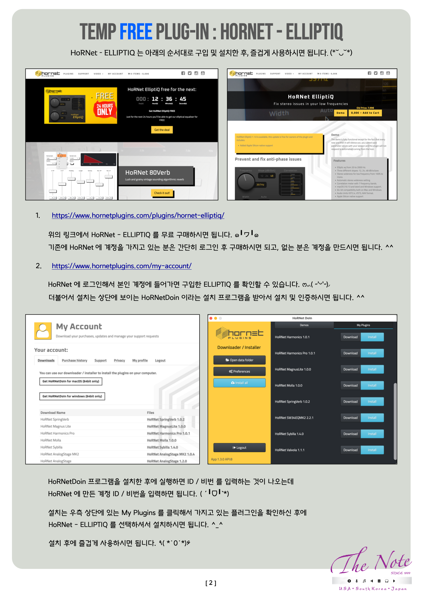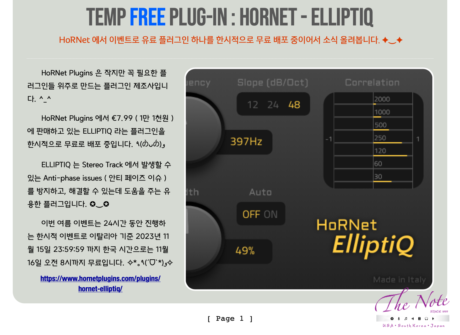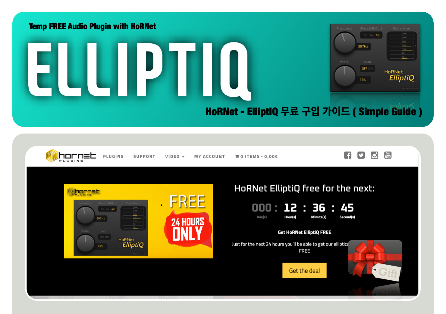 Temp FREE Audio Plugin with HoRNet HoRNet - ElliptIQ 무료 구입 가이드 ( Simple Guide ) Temp Free Plug-in : HorNet - ElliptIQ HoRNet 에서 이벤트로 유료 플러그인 하나를 한시적으로 무료 배포 중이어서 소식 올려봅니다. ✦‿✦ HoRNet Plugins 은 작지만 꼭 필요한 플러그인들 위주로 만드는 플러그인 제조사입니다. ^_^ HoRNet Plugins 에서 €7.99 ( 1만 1천원 ) 에 판매하고 있는 ELLIPTIQ 라는 플러그인을 한시적으로 무료로 배포 중입니다. ٩(の̀ᴗの́)و ELLIPTIQ 는 Stereo Track 에서 발생할 수 있는 Anti-phase issues ( 안티 페이즈 이슈 ) 를 방지하고, 해결할 수 있는데 도움을 주는 유용한 플러그입니다. ✪‿✪ 이번 여름 이벤트는 24시간 동안 진행하는 한시적 이벤트로 이탈리아 기준 2023년 11월 15일 23:59:59 까지 한국 시간으로는 11월 16일 오전 8시까지 무료입니다. ✧*。٩(ˊᗜˋ*)و✧ https://www.hornetplugins.com/plugins/hornet-elliptiq/ HoRNet - ELLIPTIQ 는 아래의 순서대로 구입 및 설치한 후, 즐겁게 사용하시면 됩니다. (*˘◡˘*) https://www.hornetplugins.com/plugins/hornet-elliptiq/ 위의 링크에서 HoRNet - ELLIPTIQ 를 무료 구매하시면 됩니다. ๑╹ワ╹๑ 기존에 HoRNet 에 계정을 가지고 있는 분은 간단히 로그인 후 구매하시면 되고, 없는 분은 계정을 만드시면 됩니다. ^^ https://www.hornetplugins.com/my-account/ HoRNet 에 로그인해서 본인 계정에 들어가면 구입한 ELLIPTIQ 를 확인할 수 있습니다. ෆ⸒⸒⸜( ˶'ᵕ'˶)⸝ 더불어서 설치는 상단에 보이는 HoRNetDoin 이라는 설치 프로그램을 받아서 설치 및 인증하시면 됩니다. ^^ HoRNetDoin 프로그램을 설치한 후에 실행하면 ID / 비번 를 입력하는 것이 나오는데 HoRNet 에 만든 계정 ID / 비번을 입력하면 됩니다. ( ´╹ᗜ╹`*) 설치는 우측 상단에 있는 My Plugins 를 클릭해서 가지고 있는 플러그인을 확인하신 후에 HoRNet - ELLIPTIQ 를 선택하셔서 설치하시면 됩니다. ^_^ 설치 후에 즐겁게 사용하시면 됩니다. ٩( *˙0˙*)۶