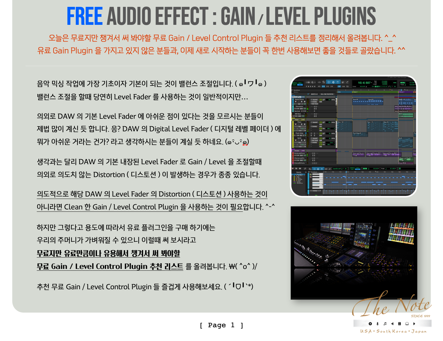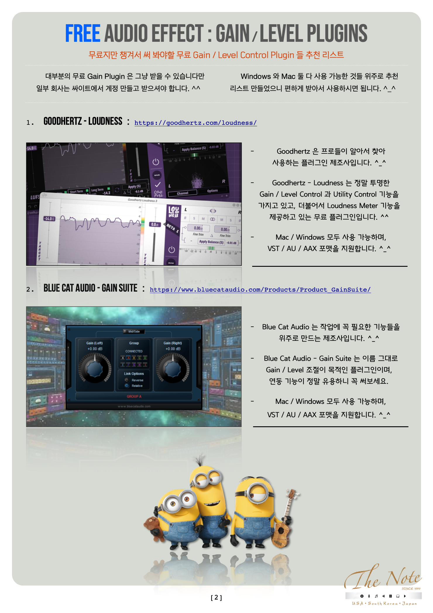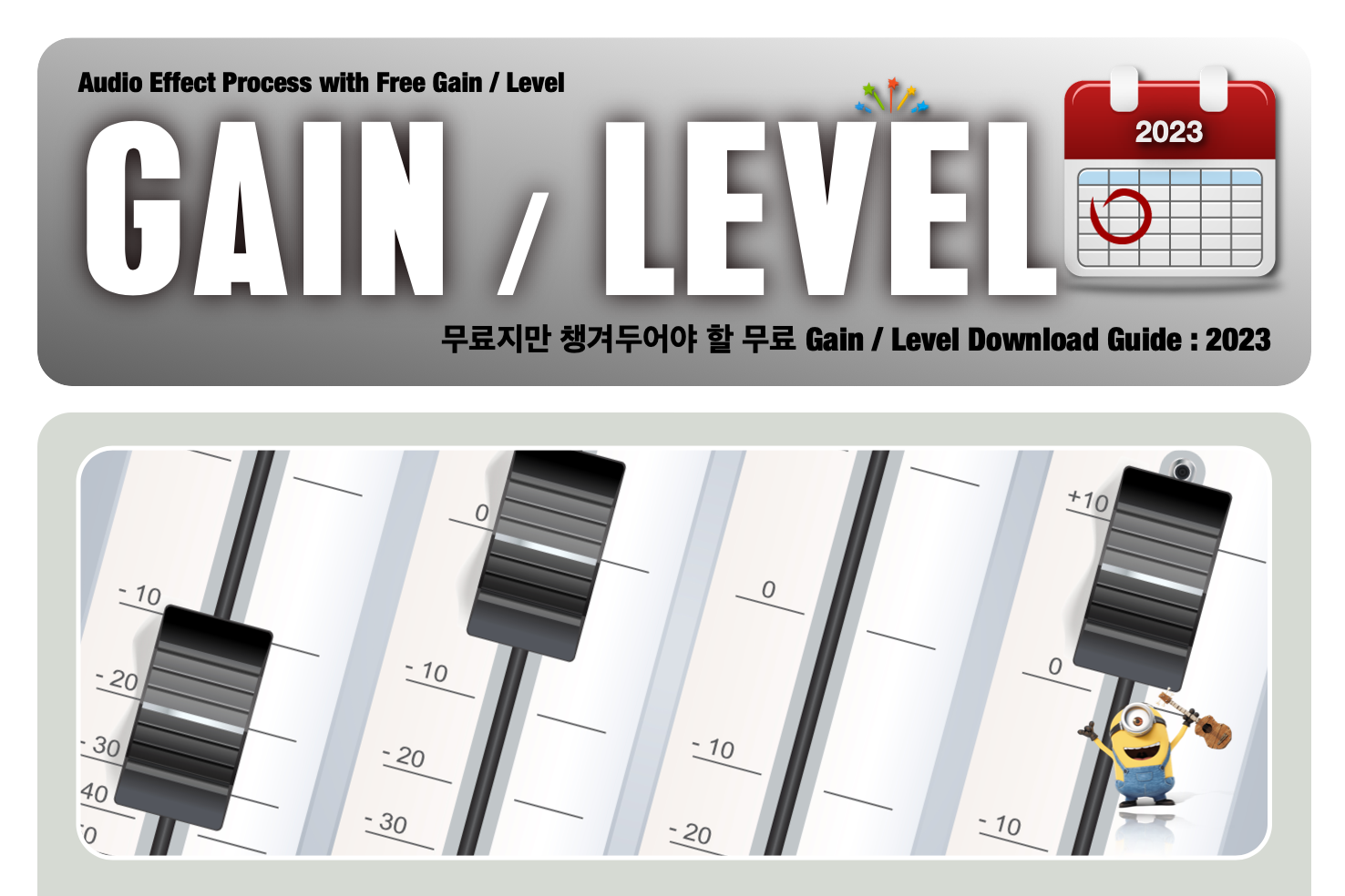 Audio Effect Process with Free Gain / Level 무료지만 챙겨두어야 할 무료 Gain / Level Download Guide : 2023 FREE Audio Effect : Gain / Level Plugins 오늘은 무료지만 챙겨서 써 봐야할 무료 Gain / Level Control Plugin 들 추천 리스트를 정리해서 올려봅니다. ^_^ 유료 Gain Plugin 을 가지고 있지 않은 분들과, 이제 새로 시작하는 분들이 꼭 한번 사용해보면 좋을 것들로 골랐습니다. ^^ 음악 믹싱 작업에 가장 기초이자 기본이 되는 것이 밸런스 조절입니다. ( ๑╹ワ╹๑ ) 밸런스 조절을 할때 당연히 Level Fader 를 사용하는 것이 일반적이지만… 의외로 DAW 의 기본 Level Fader 에 아쉬운 점이 있다는 것을 모르시는 분들이 제법 많이 계신 듯 합니다. 응? DAW 의 Digital Level Fader ( 디지털 레벨 페이더 ) 에 뭐가 아쉬운 거라는 건가? 라고 생각하시는 분들이 계실 듯 하네요. (๑・̑◡・̑๑) 생각과는 달리 DAW 의 기본 내장된 Level Fader 로 Gain / Level 을 조절할때 의외로 의도치 않는 Distortion ( 디스토션 ) 이 발생하는 경우가 종종 있습니다. 의도적으로 해당 DAW 의 Level Fader 의 Distortion ( 디스토션 ) 사용하는 것이 아니라면 Clean 한 Gain / Level Control Plugin 을 사용하는 것이 필요합니다. ^-^ 하지만 그렇다고 용도에 따라서 유료 플러그인을 구매 하기에는 우리의 주머니가 가벼워질 수 있으니 이럴때 써 보시라고 무료지만 유료만큼이나 유용해서 챙겨서 써 봐야할 무료 Gain / Level Control Plugin 추천 리스트 를 올려봅니다. \( ˆoˆ )/ 추천 무료 Gain / Level Control Plugin 들 즐겁게 사용해보세요. ( ´╹ᗜ╹`*) 무료지만 챙겨서 써 봐야할 무료 Gain / Level Control Plugin 들 추천 리스트 대부분의 무료 Gain Plugin 은 그냥 받을 수 있습니다만 일부 회사는 싸이트에서 계정 만들고 받으셔야 합니다. ^^ Windows 와 Mac 둘 다 사용 가능한 것들 위주로 추천 리스트 만들었으니 편하게 받아서 사용하시면 됩니다. ^_^ Goodhertz - Loudness : https://goodhertz.com/loudness/ Goodhertz 은 프로들이 알아서 찾아 사용하는 플러그인 제조사입니다. ^_^ Goodhertz - Loudness 는 정말 투명한 Gain / Level Control 과 Utility Control 기능을 가지고 있고, 더불어서 Loudness Meter 기능을 제공하고 있는 무료 플러그인입니다. ^^ Mac / Windows 모두 사용 가능하며, VST / AU / AAX 포맷을 지원합니다. ^_^ Blue Cat audio - Gain Suite : https://www.bluecataudio.com/Products/Product_GainSuite/ Blue Cat Audio 는 작업에 꼭 필요한 기능들을 위주로 만드는 제조사입니다. ^_^ Blue Cat Audio - Gain Suite 는 이름 그대로 Gain / Level 조절이 목적인 플러그인이며, 연동 기능이 정말 유용하니 꼭 써보세요. Mac / Windows 모두 사용 가능하며, VST / AU / AAX 포맷을 지원합니다. ^_^