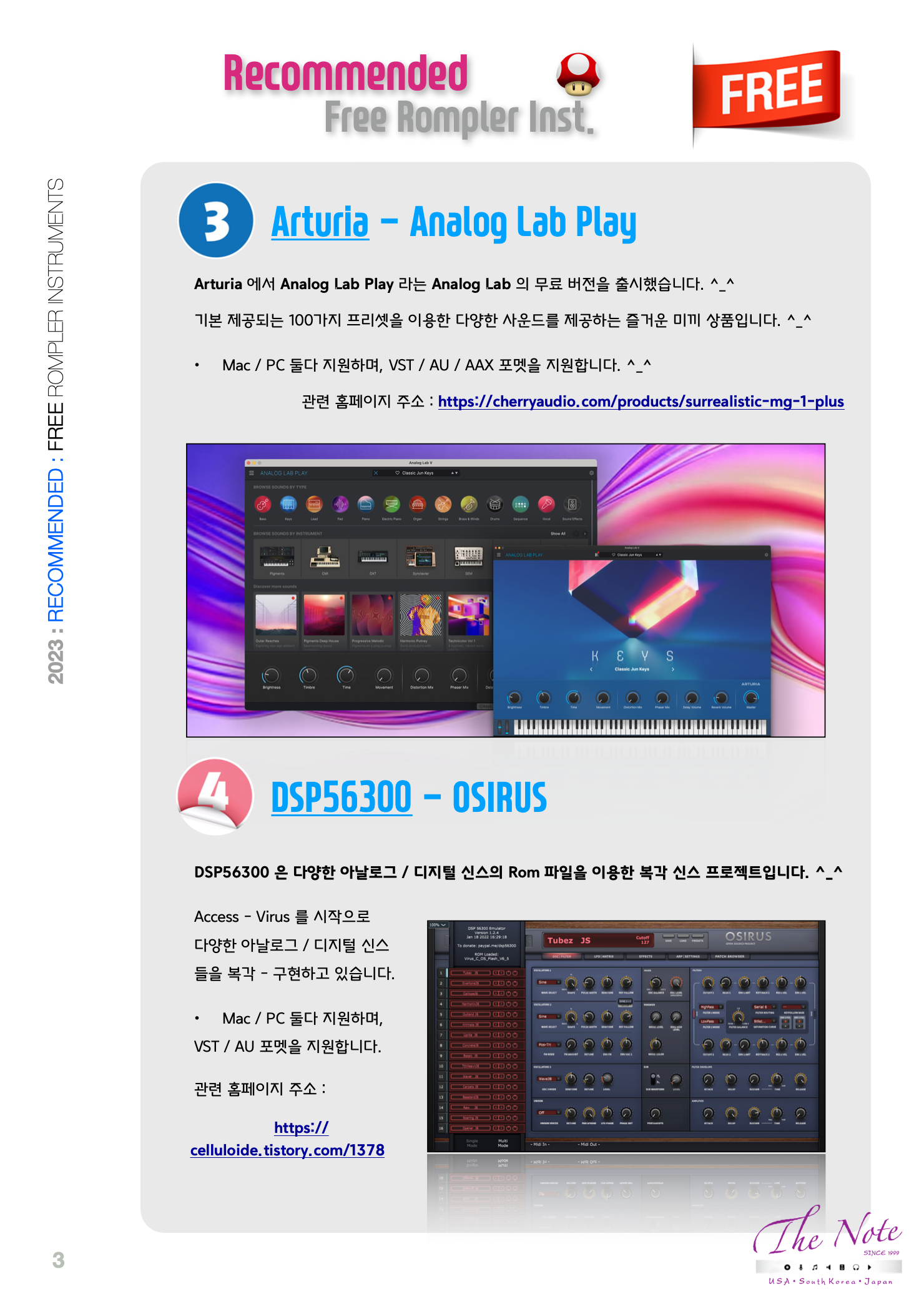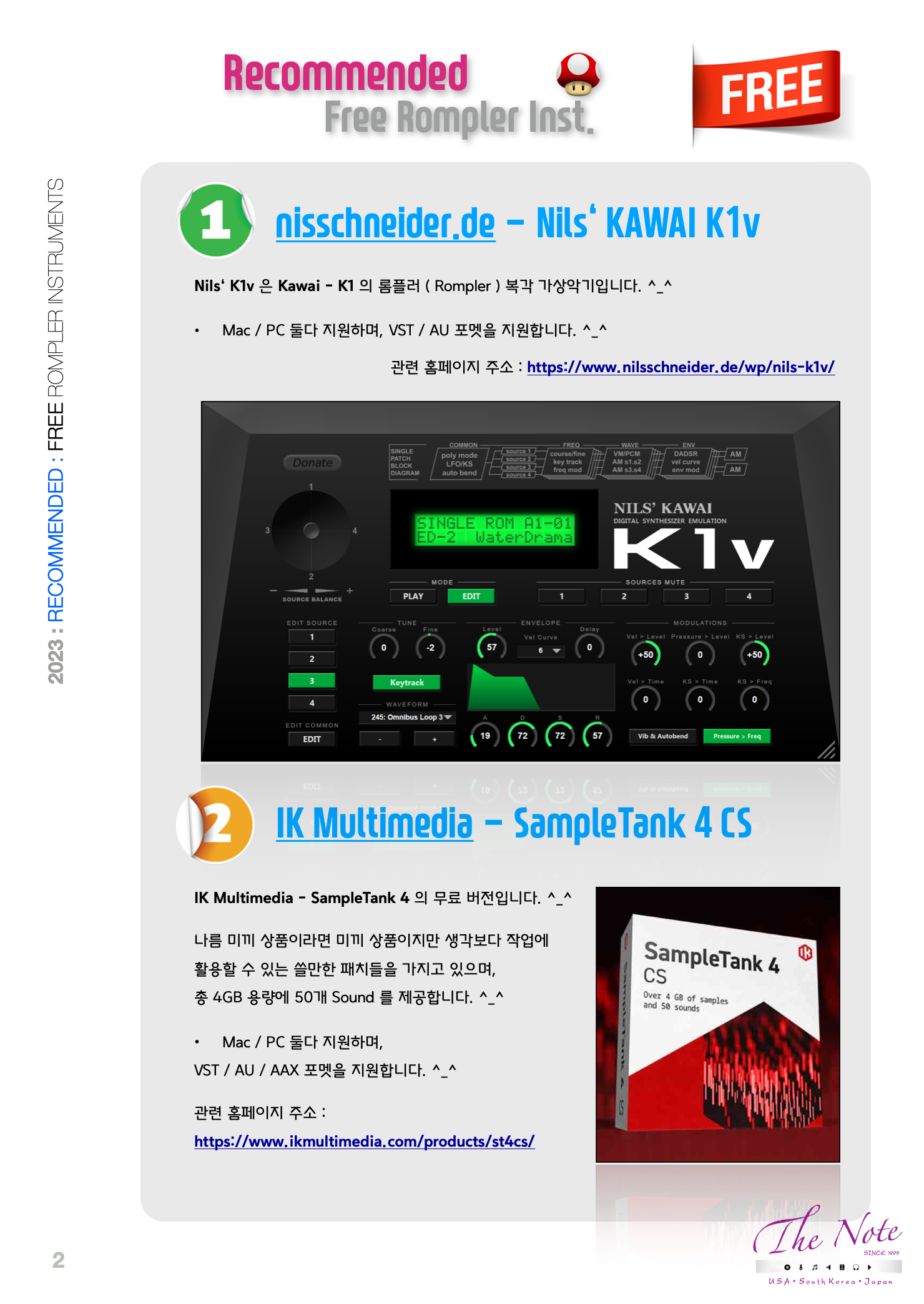 Recommended Free Rompler Inst. 추천하는 무료 Rompler 가상악기 리스트 : 2023 무료 Synth 가상악기들 중에서 추천하는 것들을 모아봤습니다. ^_^ by The Note 예전부터 많은 뮤지션들에게 사랑받았던 많은 외장 악기들은 의외로 신스보다는 롬플러 ( Rompler ) 에 해당되는 제품들이 많았습니다.. ♡(っ*’ᵕ’)’ᵕ’*c)♡ 오늘은 무료지만 많은 뮤지션들에게 사랑받았던 롬플러 ( Rompler ) 방식의 가상악기 하나와 무료지만 쓰임새가 많은 무료 롬플러 / 신스 가상악기들의 추천 List 를 만들어봤습니다. ^_^ 8번째 편으로 Free Rompler Instruments ( 무료 롬플러 가상악기들 ) 입니다. ^_^ 2023년 12월 현재 무료로 사용할 수 있는 Rompler Instruments ( 무료 롬플러 가상악기들 ) 은 많이 있지만 이 중 개인적으로 추천할만한 것들은 총 4개가 있습니다. ^_^ Rompler VSTi ( 롬플러 ) 4종류 의 무료 가상악기를 추천해봅니다. ^_^ 추천하는 모든 가상악기는 Mac / PC 둘다 지원하며, VST / AU 방식을 지원합니다. ^_^ ( AAX 포멧은 일부만 ) nisschneider.de - Nils‘ KAWAI K1v Nils‘ K1v 은 Kawai - K1 의 롬플러 ( Rompler ) 복각 가상악기입니다. ^_^ Mac / PC 둘다 지원하며, VST / AU 포멧을 지원합니다. ^_^ 관련 홈페이지 주소 : https://www.nilsschneider.de/wp/nils-k1v/ IK Multimedia - SampleTank 4 CS IK Multimedia - SampleTank 4 의 무료 버전입니다. ^_^ 나름 미끼 상품이라면 미끼 상품이지만 생각보다 작업에 활용할 수 있는 쓸만한 패치들을 가지고 있으며, 총 4GB 용량에 50개 Sound 를 제공합니다. ^_^ Mac / PC 둘다 지원하며, VST / AU / AAX 포멧을 지원합니다. ^_^ 관련 홈페이지 주소 : https://www.ikmultimedia.com/products/st4cs/ Arturia - Analog Lab Play Arturia 에서 Analog Lab Play 라는 Analog Lab 의 무료 버전을 출시했습니다. ^_^ 기본 제공되는 100가지 프리셋을 이용한 다양한 사운드를 제공하는 즐거운 미끼 상품입니다. ^_^ Mac / PC 둘다 지원하며, VST / AU / AAX 포멧을 지원합니다. ^_^ 관련 홈페이지 주소 : https://www.arturia.com/products/software-instruments/analoglab/free DSP56300 - OSIRUS DSP56300 은 다양한 아날로그 / 디지털 신스의 Rom 파일을 이용한 복각 신스 프로젝트입니다. ^_^ Access - Virus 를 시작으로 다양한 아날로그 / 디지털 신스 들을 복각 - 구현하고 있습니다. Mac / PC 둘다 지원하며, VST / AU 포멧을 지원합니다. 관련 홈페이지 주소 : https://celluloide.tistory.com/1378