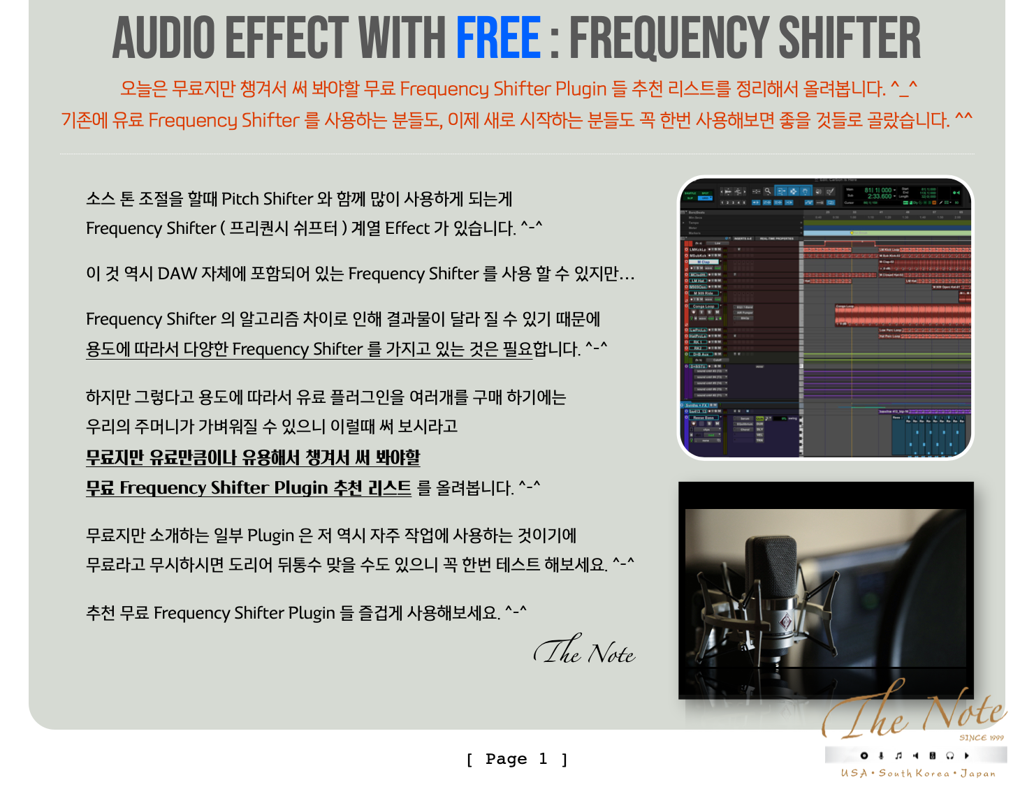 Audio Effect Process with Free Frequency Shifter 무료지만 챙겨두어야 할 무료 Frequency Shifter Download Guide : 2024 Audio Effect with FREE : Frequency Shifter 오늘은 무료지만 챙겨서 써 봐야할 무료 Frequency Shifter Plugin 들 추천 리스트를 정리해서 올려봅니다. ^_^ 기존에 유료 Frequency Shifter 를 사용하는 분들도, 이제 새로 시작하는 분들도 꼭 한번 사용해보면 좋을 것들로 골랐습니다. ^^ 소스 톤 조절을 할때 Pitch Shifter 와 함께 많이 사용하게 되는게 Frequency Shifter ( 프리퀀시 쉬프터 ) 계열 Effect 가 있습니다. ^-^ 이 것 역시 DAW 자체에 포함되어 있는 Frequency Shifter 를 사용 할 수 있지만… Frequency Shifter 의 알고리즘 차이로 인해 결과물이 달라 질 수 있기 때문에 용도에 따라서 다양한 Frequency Shifter 를 가지고 있는 것은 필요합니다. ^-^ 하지만 그렇다고 용도에 따라서 유료 플러그인을 여러개를 구매 하기에는 우리의 주머니가 가벼워질 수 있으니 이럴때 써 보시라고 무료지만 유료만큼이나 유용해서 챙겨서 써 봐야할 무료 Frequency Shifter Plugin 추천 리스트 를 올려봅니다. ^-^ 무료지만 소개하는 일부 Plugin 은 저 역시 자주 작업에 사용하는 것이기에 무료라고 무시하시면 도리어 뒤통수 맞을 수도 있으니 꼭 한번 테스트 해보세요. ^-^ 추천 무료 Frequency Shifter Plugin 들 즐겁게 사용해보세요. ^-^ The Note 무료지만 챙겨서 써 봐야할 무료 Frequency Shifter Plugin 들 추천 리스트 대부분의 무료 Plug-in 은 그냥 받을 수 있습니다만 일부 회사는 싸이트에서 계정 만들고 받으셔야 합니다. ^^ Windows 와 Mac 둘 다 사용 가능한 것들 위주로 추천 리스트 만들었으니 편하게 받아서 사용하시면 됩니다. ^_^ melda production - MFreqShifter : https://www.meldaproduction.com/MFreqShifter Melda Production 의 무료 플러그인 번들에 포함된 플러그인인 MFreqShifter 입니다. ^_^ 무료 플러그인이지만 어지한간 유료 플러그인보다 좋은 결과를 보여주는 플러그인입니다. Mac / Windows 모두 사용 가능하며, VST / AU / AAX 포맷을 지원합니다. ^_^ full bucket Music - Frequency Shifter : https://www.fullbucket.de/music/freqshifter.html Full Bucket Music 의 무료 플러그인 씨리즈 중 하나인 Frequency Shifter 입니다. ^_^ 이번에 추천하는 다른 2가지와는 사용법도 결과물도 조금은 다른 녀석이라 꼭 챙겨서 사용해보시길 추천합니다. Mac / Windows 모두 사용 가능하며, VST / AU 포맷을 지원합니다. ^_^ Kilohearts - Essentials Bundle ( Free ) : https://kilohearts.com/products/kilohearts_essentials Kilohearts 에서 기존에 유료 ( $249 / 31만 5천원 ) 로 판매하던 Professional Toolbox 를 무료로 전환했습니다. Essentials 번들에는 Frequency Shifter 가 포함되어 있고, Mac / Windows VST / AU / AAX 포맷을 지원합니다.