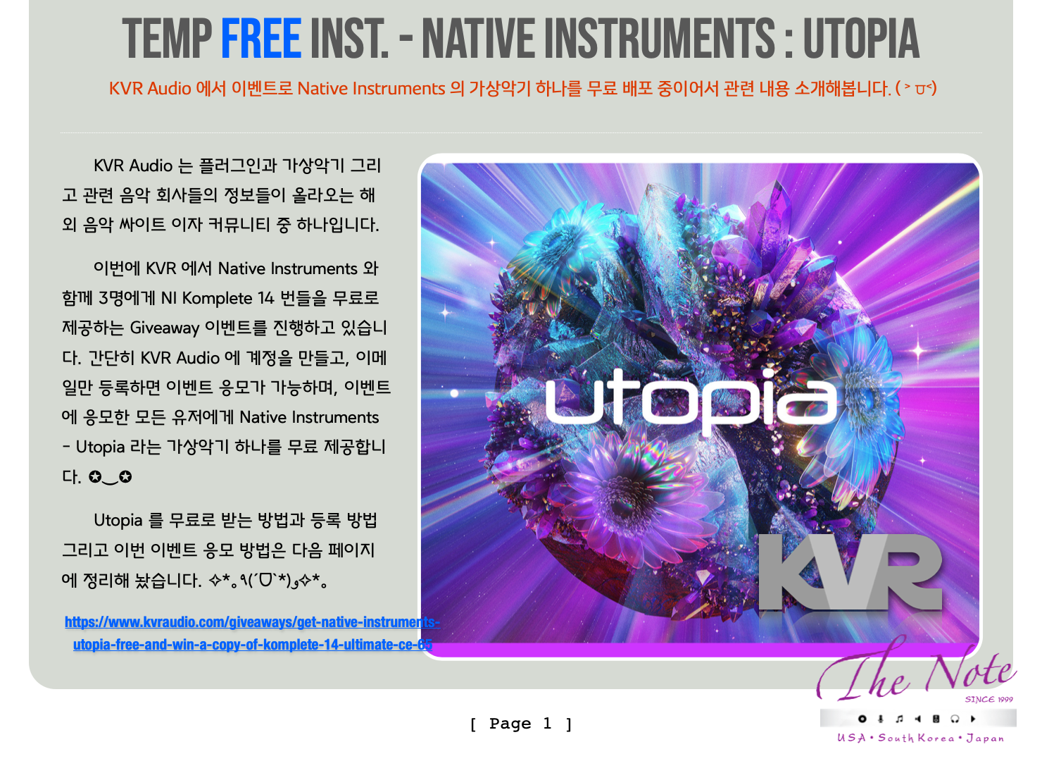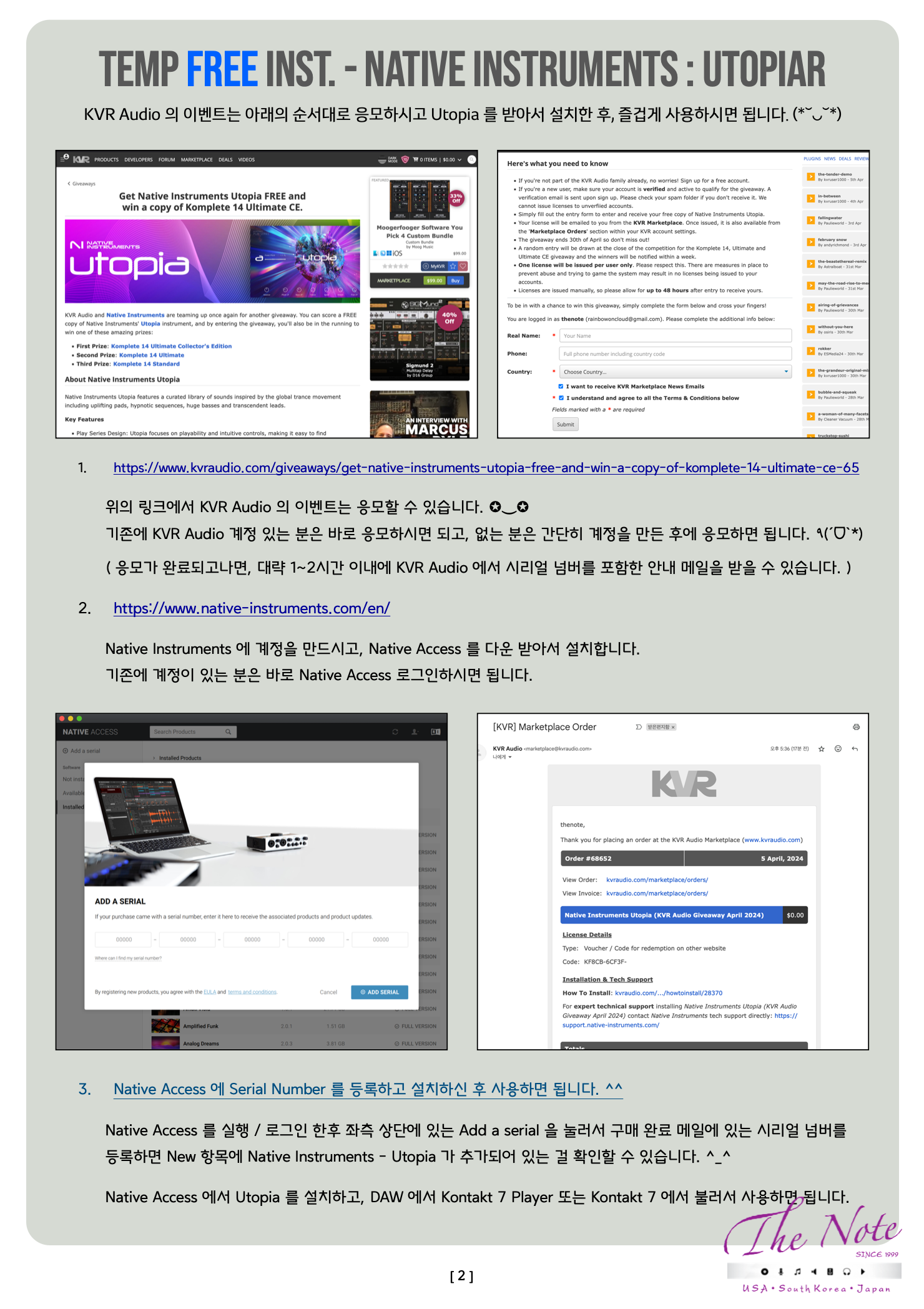 FREE VST Instruments with NI KVR Audio Native Instruments - Utopia 무료 구입 심플 가이드 ( Simple Guide ) Temp Free Inst. - Native Instruments : Utopia KVR Audio 에서 이벤트로 Native Instruments 의 가상악기 하나를 무료 배포 중이어서 관련 내용 소개해봅니다. ( ˃ ⩌˂) KVR Audio 는 플러그인과 가상악기 그리고 관련 음악 회사들의 정보들이 올라오는 해외 음악 싸이트 이자 커뮤니티 중 하나입니다. 이번에 KVR 에서 Native Instruments 와 함께 3명에게 NI Komplete 14 번들을 무료로 제공하는 Giveaway 이벤트를 진행하고 있습니다. 간단히 KVR Audio 에 계정을 만들고, 이메일만 등록하면 이벤트 응모가 가능하며, 이벤트에 응모한 모든 유저에게 Native Instruments - Utopia 라는 가상악기 하나를 무료 제공합니다. ✪‿✪ Utopia 를 무료로 받는 방법과 등록 방법 그리고 이번 이벤트 응모 방법은 다음 페이지에 정리해 놨습니다. ✧*。٩(ˊᗜˋ*)و✧*。 https://www.kvraudio.com/giveaways/get-native-instruments-utopia-free-and-win-a-copy-of-komplete-14-ultimate-ce-65 KVR Audio 의 이벤트는 아래의 순서대로 응모하시고 Utopia 를 받아서 설치한 후, 즐겁게 사용하시면 됩니다. (*˘◡˘*) https://www.kvraudio.com/giveaways/get-native-instruments-utopia-free-and-win-a-copy-of-komplete-14-ultimate-ce-65 위의 링크에서 KVR Audio 의 이벤트는 응모할 수 있습니다. ✪‿✪ 기존에 KVR Audio 계정 있는 분은 바로 응모하시면 되고, 없는 분은 간단히 계정을 만든 후에 응모하면 됩니다. ٩(ˊᗜˋ*) ( 응모가 완료되고나면, 대략 1~2시간 이내에 KVR Audio 에서 시리얼 넘버를 포함한 안내 메일을 받을 수 있습니다. ) https://www.native-instruments.com/en/ Native Instruments 에 계정을 만드시고, Native Access 를 다운 받아서 설치합니다. 기존에 계정이 있는 분은 바로 Native Access 로그인하시면 됩니다. Native Access 에 Serial Number 를 등록하고 설치하신 후 사용하면 됩니다. ^^ Native Access 를 실행 / 로그인 한후 좌측 상단에 있는 Add a serial 을 눌러서 구매 완료 메일에 있는 시리얼 넘버를 등록하면 New 항목에 Native Instruments - Utopia 가 추가되어 있는 걸 확인할 수 있습니다. ^_^ Native Access 에서 Utopia 를 설치하고, DAW 에서 Kontakt 7 Player 또는 Kontakt 7 에서 불러서 사용하면 됩니다.