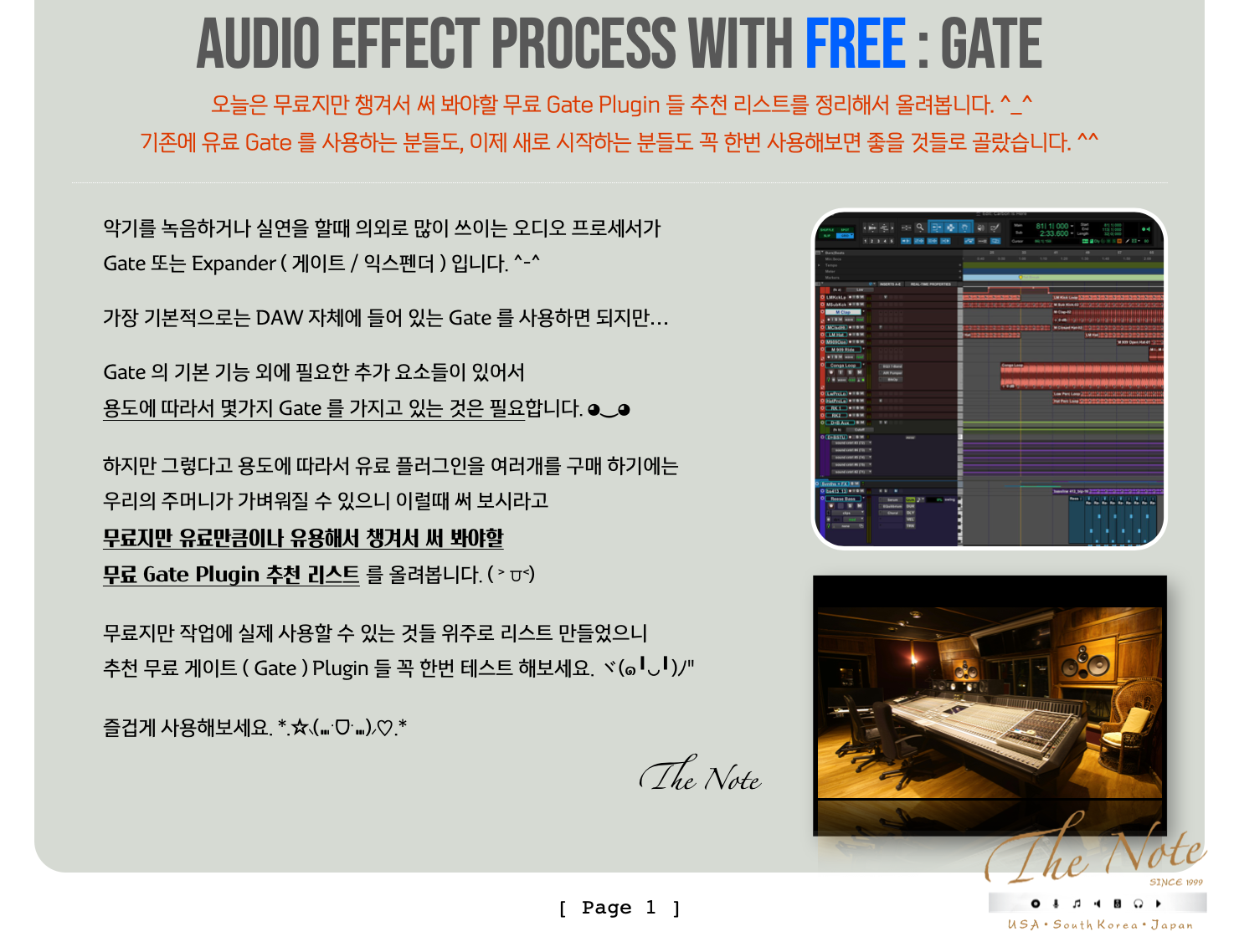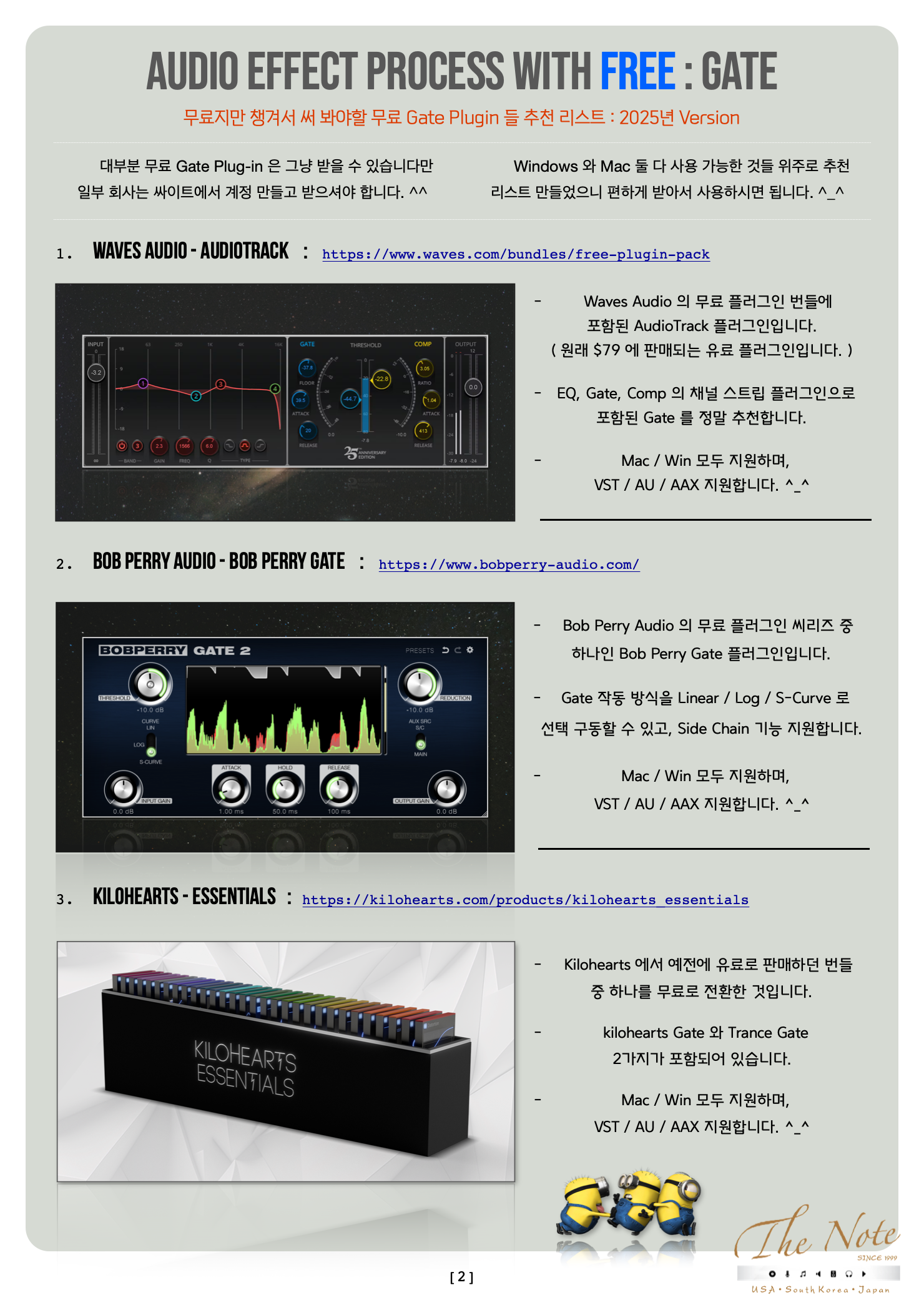 Audio Effect Process with Free Gate 무료지만 챙겨두어야 할 무료 Gate Download Guide : 2025 Audio Effect Process with FREE : Gate 오늘은 무료지만 챙겨서 써 봐야할 무료 Gate Plugin 들 추천 리스트를 정리해서 올려봅니다. ^_^ 기존에 유료 Gate 를 사용하는 분들도, 이제 새로 시작하는 분들도 꼭 한번 사용해보면 좋을 것들로 골랐습니다. ^^ 악기를 녹음하거나 실연을 할때 의외로 많이 쓰이는 오디오 프로세서가 Gate 또는 Expander ( 게이트 / 익스펜더 ) 입니다. ^-^ 가장 기본적으로는 DAW 자체에 들어 있는 Gate 를 사용하면 되지만… Gate 의 기본 기능 외에 필요한 추가 요소들이 있어서 용도에 따라서 몇가지 Gate 를 가지고 있는 것은 필요합니다. ◕‿◕ 하지만 그렇다고 용도에 따라서 유료 플러그인을 여러개를 구매 하기에는 우리의 주머니가 가벼워질 수 있으니 이럴때 써 보시라고 무료지만 유료만큼이나 유용해서 챙겨서 써 봐야할 무료 Gate Plugin 추천 리스트 를 올려봅니다. ( ˃ ⩌˂) 무료지만 작업에 실제 사용할 수 있는 것들 위주로 리스트 만들었으니 추천 무료 게이트 ( Gate ) Plugin 들 꼭 한번 테스트 해보세요. ヾ(๑╹◡╹)ノ" 즐겁게 사용해보세요. *.☆⸜(⑉˙ᗜ˙⑉)⸝♡.* The Note 무료지만 챙겨서 써 봐야할 무료 Gate Plugin 들 추천 리스트 : 2025년 Version 대부분 무료 Gate Plug-in 은 그냥 받을 수 있습니다만 일부 회사는 싸이트에서 계정 만들고 받으셔야 합니다. ^^ Windows 와 Mac 둘 다 사용 가능한 것들 위주로 추천 리스트 만들었으니 편하게 받아서 사용하시면 됩니다. ^_^ Waves Audio - Audiotrack : https://www.waves.com/bundles/free-plugin-pack Waves Audio 의 무료 플러그인 번들에 포함된 AudioTrack 플러그인입니다. ( 원래 $79 에 판매되는 유료 플러그인입니다. ) EQ, Gate, Comp 의 채널 스트립 플러그인으로 포함된 Gate 를 정말 추천합니다. Mac / Win 모두 지원하며, VST / AU / AAX 지원합니다. ^_^ Bob Perry Audio - Bob Perry Gate : https://www.bobperry-audio.com/ Bob Perry Audio 의 무료 플러그인 씨리즈 중 하나인 Bob Perry Gate 플러그인입니다. Gate 작동 방식을 Linear / Log / S-Curve 로 선택 구동할 수 있고, Side Chain 기능 지원합니다. Mac / Win 모두 지원하며, VST / AU / AAX 지원합니다. ^_^ Auburn Sounds - Renegade : https://www.auburnsounds.com/products/Renegate.html Auburn Sounds 의 무료 플러그인 씨리즈 중 하나인 Renegade 플러그인입니다. 기본 Gate 기능 외에 Step Sequencer 기능이 추가되어 있는 Gate 플러그인입니다. Mac / Win 모두 지원하며, VST / AU / AAX 지원합니다. ^_^ kilohearts - Essentials : https://kilohearts.com/products/kilohearts_essentials Kilohearts 에서 예전에 유료로 판매하던 번들 중 하나를 무료로 전환한 것입니다. kilohearts Gate 와 Trance Gate 2가지가 포함되어 있습니다. Mac / Win 모두 지원하며, VST / AU / AAX 지원합니다. ^_^ Mogwai AudioTools - MGate Multi : https://www.bobperry-audio.com/ Mogwai AudioTools 의 무료 플러그인인 MGate Multi 플러그인입니다. ( 원래 $9.99 에 판매되는 유료 플러그인입니다. ) 대역 별로 Gate 를 사용할 수 있습니다. Mac / Win 모두 지원하며, VST / AU / AAX 지원합니다. ^_^