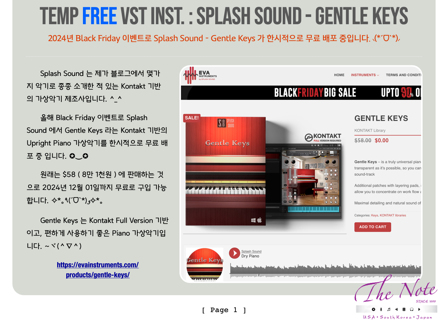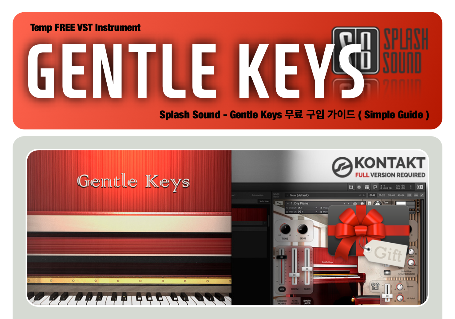 Temp FREE VST Instrument Splash Sound - Gentle Keys 무료 구입 가이드 ( Simple Guide ) Temp Free VST Inst. : Splash Sound - Gentle Keys 2024년 Black Friday 이벤트로 Splash Sound - Gentle Keys 가 한시적으로 무료 배포 중입니다. ⸜(*ˊᗜˋ*)⸝ Splash Sound 는 제가 블로그에서 몇가지 악기로 종종 소개한 적 있는 Kontakt 기반의 가상악기 제조사입니다. ^_^ 올해 Black Friday 이벤트로 Splash Sound 에서 Gentle Keys 라는 Kontakt 기반의 Upright Piano 가상악기를 한시적으로 무료 배포 중 입니다. ✪‿✪ 원래는 $58 ( 8만 1천원 ) 에 판매하는 것으로 2024년 12월 01일까지 무료로 구입 가능합니다. ✧*。٩(ˊᗜˋ*)و✧*。 Gentle Keys 는 Kontakt Full Version 기반이고, 편하게 사용하기 좋은 Piano 가상악기입니다. ~ヾ(^∇^) https://evainstruments.com/products/gentle-keys/