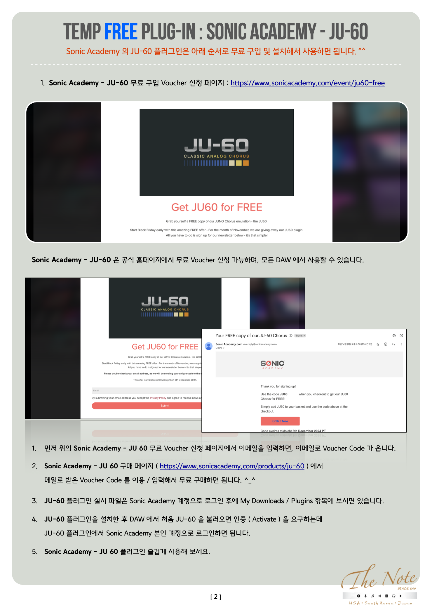 Temp FREE Audio Plug-in Sonic Academy : JU-60 무료 구입 가이드 ( Simple Guide ) Temp Free Plug-in : Sonic Academy - Ju-60 Sonic Academy 의 유료 플러그인 하나를 무료로 받을 수 있어서 관련 소식 올려봅니다. . ¡¡¡( •̀ ᴗ •́ )و!!! Sonic Academy 는 다양한 음악 강좌들과 가상악기 / 플러그인을 판매하고 있는 회사입니다. ( ◕‿◕ )/ 이번에 Roland Juno Synth 에 들어갔던 Chorus 플러그인을 기반한 JU-60 이라는 Chorus 플러그인을 출시하면서 출시 기념으로 한시적으로 무료 배포하고 있어서 관련 소식 소개해봅니다. ✪‿✪ Sonic Academy : JU-60 은 $25.35 ( 3만 5천원 ) 에 판매하는 플러그인으로 2024년 12월 08일까지만 무료 구매 가능한 Voucher Code 를 받을 수 있습니다. ٩(ˊᗜˋ*)و 즐겁게 사용해보세요. ✧*。٩(ˊᗜˋ*)و✧*。 https://www.sonicacademy.com/event/ju60-free Sonic Academy 의 JU-60 플러그인은 아래 순서로 무료 구입 및 설치해서 사용하면 됩니다. ^^ Sonic Academy - JU-60 무료 구입 Voucher 신청 페이지 : https://www.sonicacademy.com/event/ju60-free Sonic Academy - JU-60 은 공식 홈페이지에서 무료 Voucher 신청 가능하며, 모든 DAW 에서 사용할 수 있습니다. 먼저 위의 Sonic Academy - JU 60 무료 Voucher 신청 페이지에서 이메일을 입력하면, 이메일로 Voucher Code 가 옵니다. Sonic Academy - JU 60 구매 페이지 ( https://www.sonicacademy.com/products/ju-60 ) 에서 메일로 받은 Voucher Code 를 이용 / 입력해서 무료 구매하면 됩니다. ^_^ JU-60 플러그인 설치 파일은 Sonic Academy 계정으로 로그인 후에 My Downloads / Plugins 항목에 보시면 있습니다. JU-60 플러그인을 설치한 후 DAW 에서 처음 JU-60 을 불러오면 인증 ( Activate ) 을 요구하는데 JU-60 플러그인에서 Sonic Academy 본인 계정으로 로그인하면 됩니다. Sonic Academy - JU 60 플러그인 즐겁게 사용해 보세요.