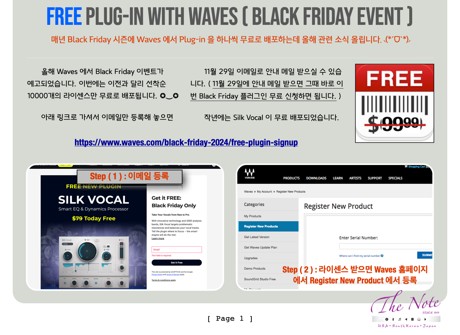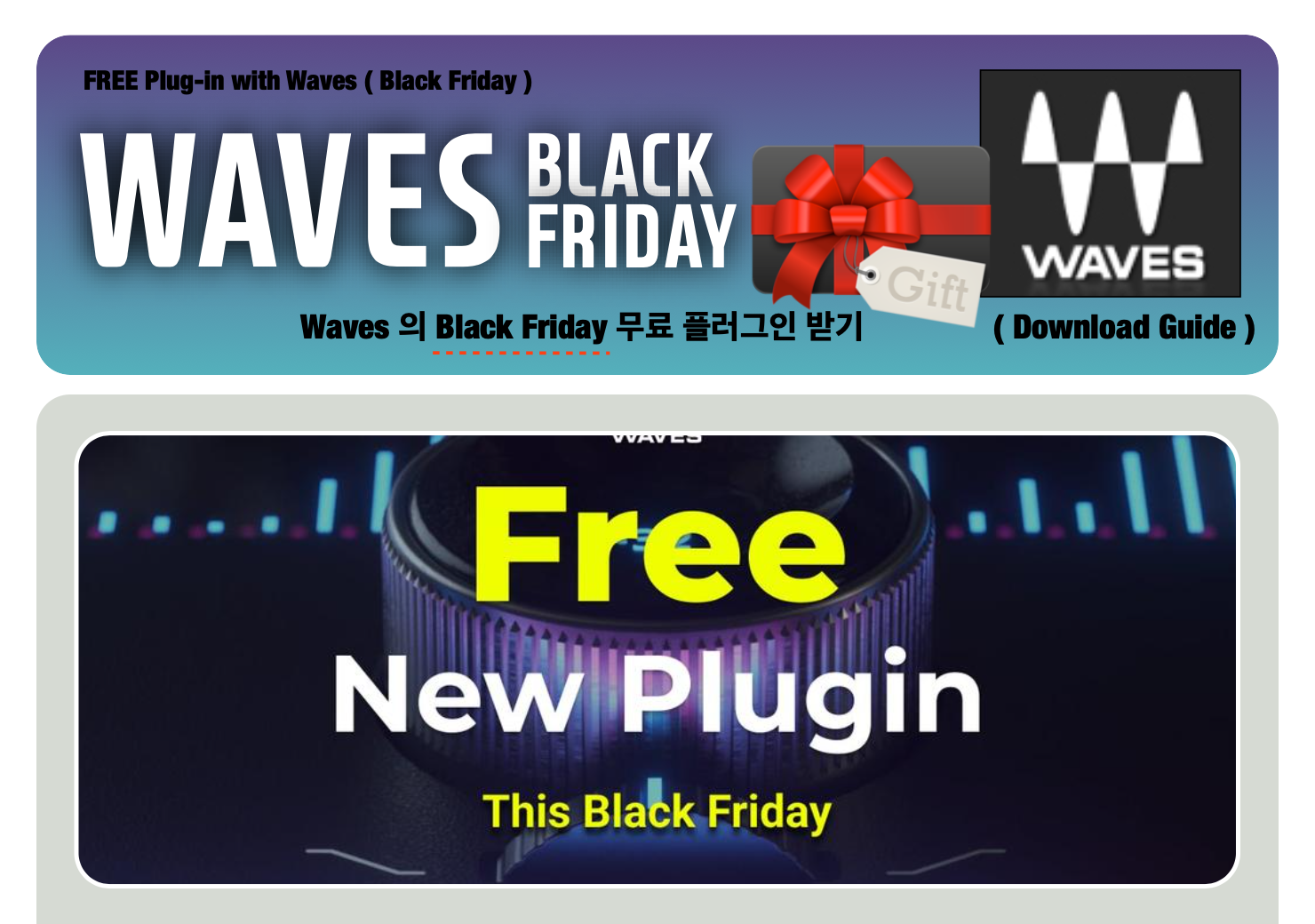 FREE Plug-in with Waves ( Black Friday ) Waves 의 Black Friday 무료 플러그인 받기 ( Download Guide ) Free Plug-in with Waves ( Black Friday Event ) 매년 Black Friday 시즌에 Waves 에서 Plug-in 을 하나씩 무료로 배포하는데 올해 관련 소식 올립니다. ⸜(*ˊᗜˋ*)⸝ 올해 Waves 에서 Black Friday 이벤트가 예고되었습니다. 이번에는 이전과 달리 선착순 10000개의 라이센스만 무료로 배포됩니다. ✪‿✪ 아래 링크로 가셔서 이메일만 등록해 놓으면 11월 29일 이메일로 안내 메일 받으실 수 있습니다. ( 11월 29일에 안내 메일 받으면 그때 바로 이번 Black Friday 플러그인 무료 신청하면 됩니다. ) 작년에는 Silk Vocal 이 무료 배포되었습니다. https://www.waves.com/black-friday-2024/free-plugin-signup