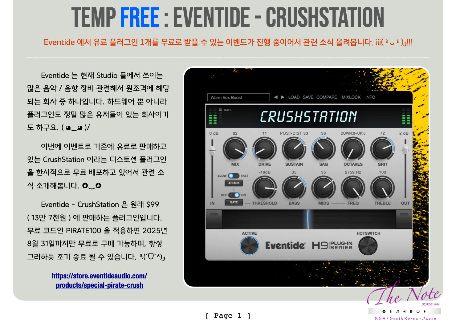 Temp FREE Audio Plug-in Eventide : CrushStation 무료 구입 가이드 ( Simple Guide ) Temp Free : Eventide - Crushstation Eventide 에서 유료 플러그인 1개를 무료로 받을 수 있는 이벤트가 진행 중이어서 관련 소식 올려봅니다. ¡¡¡( •̀ ᴗ •́ )و!!! Eventide 는 현재 Studio 들에서 쓰이는 많은 음악 / 음향 장비 관련해서 원조격에 해당되는 회사 중 하나입니다. 하드웨어 뿐 아니라 플러그인도 정말 많은 유저들이 있는 회사이기도 하구요. ( ◕‿◕ )/ 이번에 이벤트로 기존에 유료로 판매하고 있는 CrushStation 이라는 디스토션 플러그인을 한시적으로 무료 배포하고 있어서 관련 소식 소개해봅니다. ✪‿✪ Eventide - CrushStation 은 원래 $99 ( 13만 7천원 ) 에 판매하는 플러그인입니다. 무료 코드인 PIRATE100 을 적용하면 2025년 8월 31일까지만 무료로 구매 가능하며, 항상 그러하듯 조기 종료 될 수 있습니다. ٩(ˊᗜˋ*)و https://store.eventideaudio.com/products/special-pirate-crush 무료로 Eventide 의 플러그인을 사용하기 위해선 http://www.ilok.com 아이디가 있어야 합니다. 기존에 가지고 있으신 분은 다음 페이지의 안내 순서대로 무료 구입 및 등록하시면 됩니다. ^_^ iLok 과 Eventide 두개 모두 아이디가 없으신 분은 우선 먼저 iLok.com 의 아이디를 만드셔야 합니다. http://www.ilok.com 간단히 사용할 아이디와 이름, 주소, 연동될 이메일 주소를 입력하시면 간단히 아이디가 만들어집니다. ^_^ 아이디를 만드신 후에는 홈페이지에서 iLok License Manager 를 받으셔서 설치 하시면 됩니다. ^^ 비번 설정은 8자 이상이어야 하며 반드시 한개이상의 대문자를 포함해야 합니다. CrushStation 플러그인은 아래 순서로 무료 구입 및 설치해서 사용하면 됩니다. ^^ Eventide - CrushStation 플러그인은 공식 홈페이지에서 무료 신청해서, 라이센스 Voucher 를 받을 수 있습니다. Eventide - CrushStation 플러그인은 공식 홈페이지에서 무료 신청해서, 라이센스 Voucher 를 받을 수 있습니다. CrushStation 무료 구매 페이지에서 Claim Offer 를 누른 후 구매를 진행하면, 입력한 이메일로 라이센스가 옵니다. 기존에 Eventide 계정에 없는 분은 계정을 만드신 후 구매를 진행하시면 됩니다. Eventide 홈페이지 ( https://www.eventideaudio.com/my-account/ ) 로그인 후에 본인 계정의 Register Products 항목에서 CrushStation 플러그인 라이센스를 등록할 수 있습니다. ^_^ Register a New Plug-in 에 받은 License Key 를 적고, 그 아래 iLok Account 를 적고나면 Summit 하면 됩니다. iLok 계정의 CrushStation 라이센스를 본인의 iLok Key 또는 Computer 로 라이센스를 옮기세요. - iLok Key 가 없는 분은 iLok Computer 로 인증 가능하면 iLok USB Key 가 없어도 CrushStation 플러그인 사용 가능합니다. https://www.eventideaudio.com/downloads/ : CrushStation 설치 파일 받아서 설치 후 사용하면 됩니다. CrushStation 플러그인은 Mac / PC 을 지원하며, AU / VST / AAX 포멧을 지원합니다. (๑’ᗢ’๑)ฅ