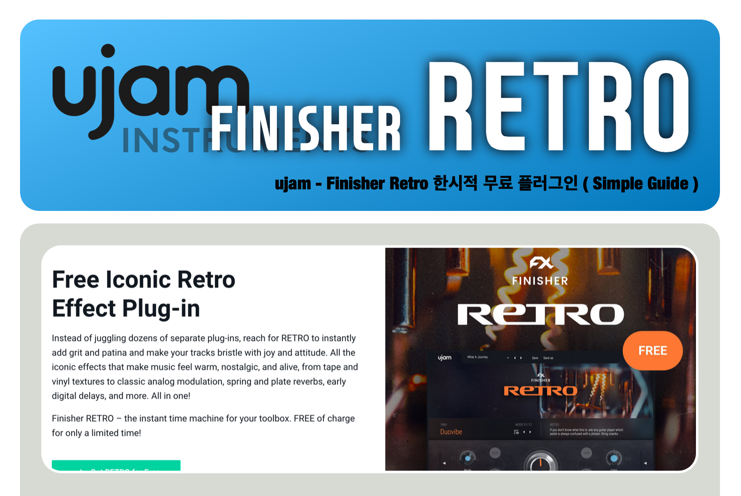 Temp Free Plugin with ujam ujam - Finisher Retro 한시적 무료 플러그인 ( Simple Guide ) ujam - Finisher Retro ( temp FREE FX PLUG-IN ) UJAM 은 Virtual Guitarist 씨리즈 가상악기로 유명한 곳입니다. 이번에 유료 플러그인 중 하나를 한시적으로 무료로 배포하고 있어서 관련 소식 소개해봅니다. ^_^ UJAM 의 Finisher Retro 는 60~80년대 사운드를 기반한 멀티 이펙트 플러그인입니다. ✪‿✪ UJAM - Finisher Retro 는 20개가 넘는 사운드 모듈과 50가지의 모드를 이용해서 여러가지 소리를 만들어 낼 수 있는 멀티 플러그인입니다. 간단히 사용할 수 있는 프리셋도 100가지 제공하고 있어 즐겁게 사용해보시면 됩니다. ✧*。٩(ˊᗜˋ*)و✧*。 UJAM - Finisher Retro 는 원래 $59 ( 8만 3천원 ) 에 판매하는 유료 플러그인으로 한시적으로 무료로 받을 수 있으며, 조기 종료 될 수 있습니다. = ujam - Finisher Retro 무료 링크 = https://www.ujam.com/ufx/reverb/ https://www.pluginboutique.com/product/2-Effects/53-Multi-Effect-/7464-Finisher-RETRO