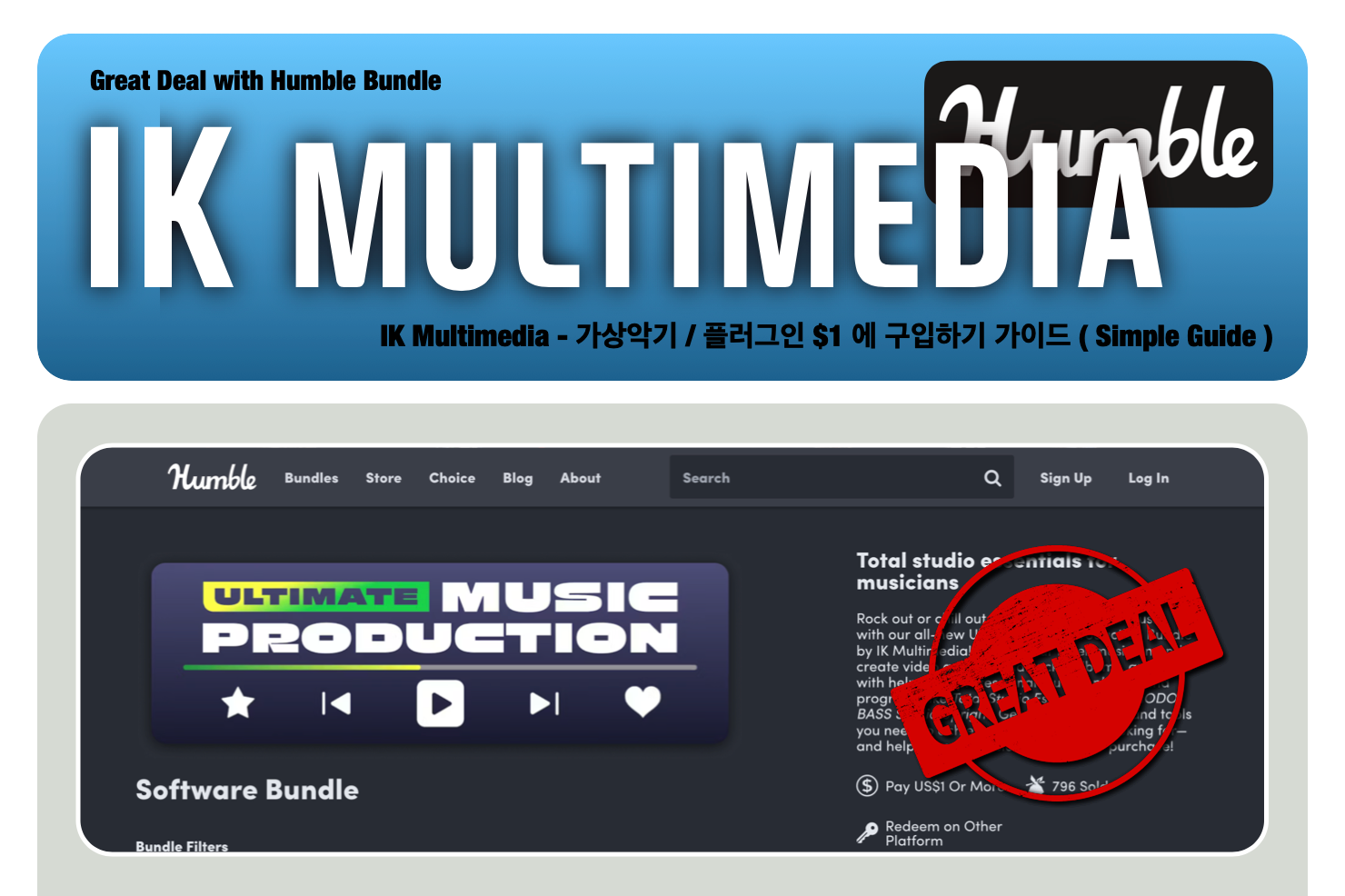 Great Deal with Humble Bundle IK Multimedia - 가상악기 / 플러그인 $1 에 구입하기 가이드 ( Simple Guide ) Great deal with humble bundle Humble Bundle 에서 $1 또는 $30 에 IK Multimedia 의 가상악기 / 플러그인들을 구매할 수 있는 폭탄 세일 하고 있어서 관련 소식 올려봅니다. ⸜( ˙ ˘ ˙)⸝♡ Humble Bundle ( 험블 번들 ) 은 게임이나 책 그리고 프로그램을 저렴하게 판매하는 유명한 할인 판매 싸이트입니다. ٩(๑❛ワ❛๑) 이번에 Humble Bundle ( 험블 번들 ) 에서 IK Multimedia 가상악기 / 플러그인을 한시적으로 $1 또는 $30 에 폭탄 세일하고 있습니다. ⸜(⑉˙ᗜ˙⑉)⸝ Humble Bundle 에서는 현재 Ultimate Music Production 이라는 번들이 폭탄 세일 중입니다. $1 에는 Miroslav Philharmonik 2 CE 라는 오케스트라 가상악기를 구매할 수 있고, $30 에는 총 27가지 종류의 플러그인 번들 / 가상악기 라이브러리 ( 실제 $600 / 85만원 ) 를 한시적으로 저렴하게 구매할 수 있습니다. ٩(•̤̀ᵕ•̤́๑)૭✧ 살펴보시고 필요하신 분 구매해보세요 ✿(′ᵕ′*) https://www.humblebundle.com/software/ultimate-music-production-bundle-encore-software