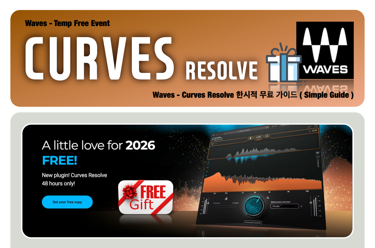 Waves - Temp Free Event Waves - Curves Resolve 한시적 무료 가이드 ( Simple Guide ) Waves : Curves Resolve - Temp Free Waves 에서 새해 초 이벤트로 새로운 플러그인 하나를 한시적으로 무료 배포 중이어서 소개해봅니다. ^_^ Waves 는 대부분의 Studio 와 작곡가 그리고 프로듀서들이 표준처럼 사용하는 플러그인 회사입니다. ◕‿◕ 새해 초 이벤트로 Curves Resolve 라는 믹스의 선명도를 잡아 주는 밸런스 플러그인을 48시간동안 한시적으로 무료 제공하는 이벤트가 진행 중입니다. ( ´╹ᗜ╹`*) Waves - Curves Resolve 는 다양한 소스간의 마스킹되는 프리퀀시를 찾아서 해당 프리퀀시만 조절해주는 밸런스 플러그인으로 이런 류의 플러그인이 없는 분은 하나는 반드시 가지고 있으셔야 할 유용한 플러그인입니다. ^_^ 2026년 1월 21일까지 무료로 받으실 수 있으며, 이후에는 유료 판매가 됩니다. 언제든 조기 종료 될 수 있으니 바로 받아두시는 걸 권해드립니다.O(≧∇≦)O Waves 홈페이지에서 계정을 만든 후 로그인을 합니다. ^_^ ( 기존에 계정 있는 분은 로그인만.. ) 아래 링크에서 Get Curves Resolve Free 를 누르면 계정에 자동으로 라이센스가 추가됩니다. ^_^ https://www.waves.com/plugins/curves-resolve 2026년 1월 21일까지만 유효한 이벤트입니다. ^_^ 즐겁게 사용해보세요.