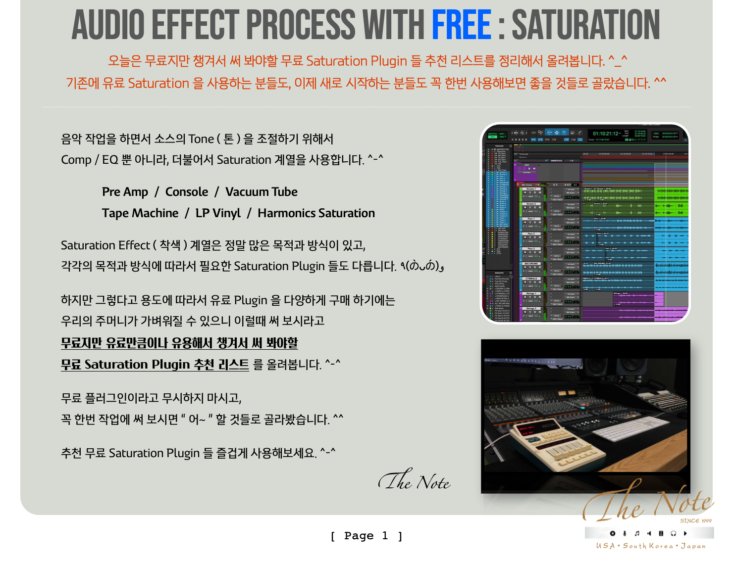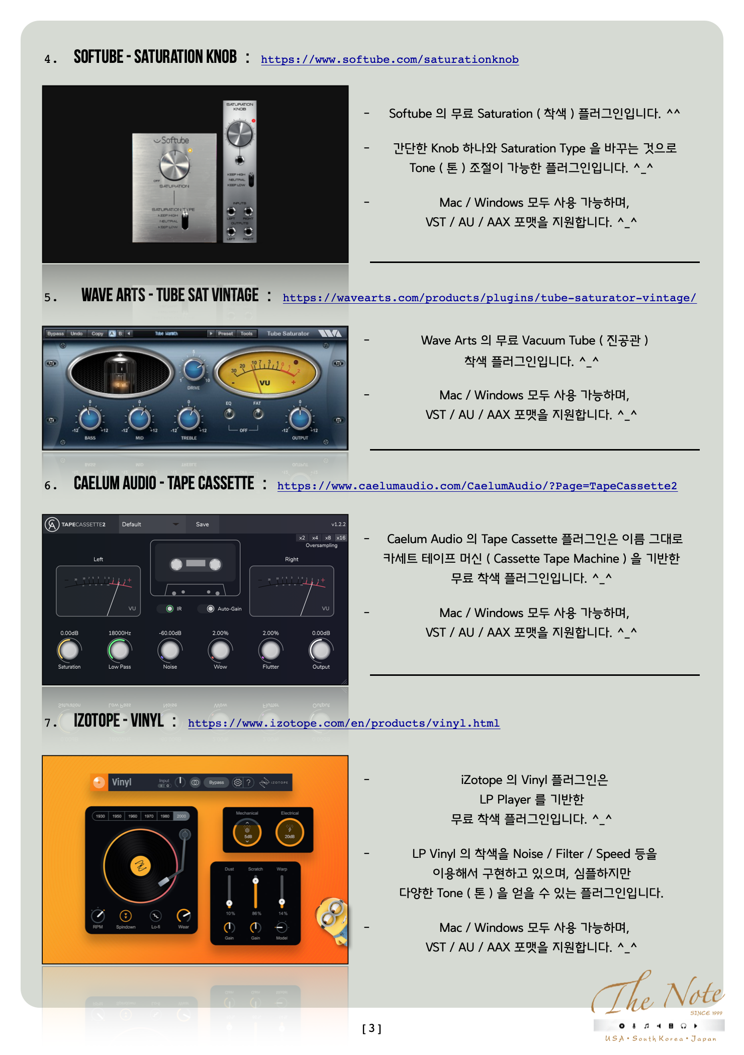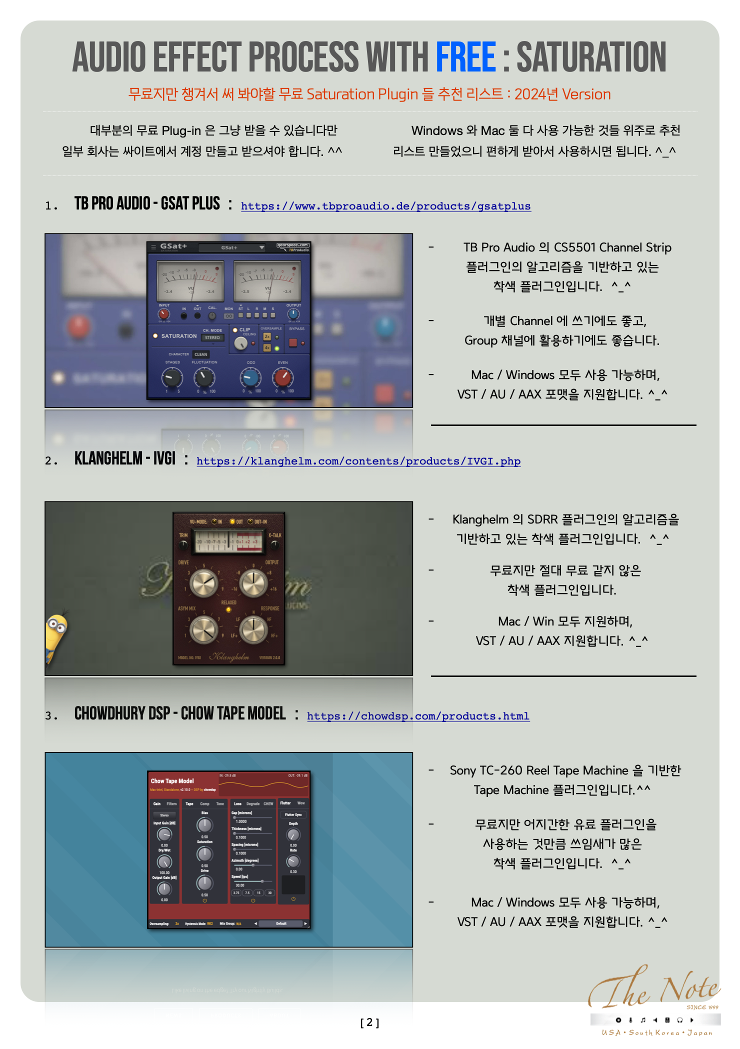 Audio Effect Process with Free Saturation 무료지만 챙겨두어야 할 무료 Saturation Plugin Download Guide : 2022 Audio Effect Process with FREE : Saturation 오늘은 무료지만 챙겨서 써 봐야할 무료 Saturation Plugin 들 추천 리스트를 정리해서 올려봅니다. ^_^ 기존에 유료 Saturation 을 사용하는 분들도, 이제 새로 시작하는 분들도 꼭 한번 사용해보면 좋을 것들로 골랐습니다. ^^ 음악 작업을 하면서 소스의 Tone ( 톤 ) 을 조절하기 위해서 Comp / EQ 뿐 아니라, 더불어서 Saturation 계열을 사용합니다. ^-^ Pre Amp / Console / Vacuum Tube Tape Machine / LP Vinyl / Harmonics Saturation Saturation Effect ( 착색 ) 계열은 정말 많은 목적과 방식이 있고, 각각의 목적과 방식에 따라서 필요한 Saturation Plugin 들도 다릅니다. ٩(の̀ᴗの́)و 하지만 그렇다고 용도에 따라서 유료 Plugin 을 다양하게 구매 하기에는 우리의 주머니가 가벼워질 수 있으니 이럴때 써 보시라고 무료지만 유료만큼이나 유용해서 챙겨서 써 봐야할 무료 Saturation Plugin 추천 리스트 를 올려봅니다. ^-^ 무료 플러그인이라고 무시하지 마시고, 꼭 한번 작업에 써 보시면 “ 어~ ” 할 것들로 골라봤습니다. ^^ 추천 무료 Saturation Plugin 들 즐겁게 사용해보세요. ^-^ The Note 무료지만 챙겨서 써 봐야할 무료 Saturation Plugin 들 추천 리스트 : 2022년 Version 대부분의 무료 Plug-in 은 그냥 받을 수 있습니다만 일부 회사는 싸이트에서 계정 만들고 받으셔야 합니다. ^^ Windows 와 Mac 둘 다 사용 가능한 것들 위주로 추천 리스트 만들었으니 편하게 받아서 사용하시면 됩니다. ^_^ TB Pro Audio - GSat Plus : https://www.tbproaudio.de/products/gsatplus TB Pro Audio 의 CS5501 Channel Strip 플러그인의 알고리즘을 기반하고 있는 착색 플러그인입니다. ^_^ 개별 Channel 에 쓰기에도 좋고, Group 채널에 활용하기에도 좋습니다. Mac / Windows 모두 사용 가능하며, VST / AU / AAX 포맷을 지원합니다. ^_^ Klanghelm - IVGI : https://klanghelm.com/contents/products/IVGI.php Klanghelm 의 SDRR 플러그인의 알고리즘을 기반하고 있는 착색 플러그인입니다. ^_^ Reverb Solo 는 Reverb 라는 회사와 연계해서 만든 무료 버전입니다. Mac / Win 모두 지원하며, VST / AU / AAX 지원합니다. ^_^ Chowdhury DSP - Chow Tape Model : https://chowdsp.com/products.html Sony TC-260 Reel Tape Machine 을 기반한 Tape Machine 플러그인입니다.^^ 무료지만 어지간한 유료 플러그인을 사용하는 것만큼 쓰임새가 많은 착색 플러그인입니다. ^_^ Mac / Windows 모두 사용 가능하며, VST / AU / AAX 포맷을 지원합니다. ^_^ Softube - Saturation Knob : https://www.softube.com/saturationknob Softube 의 무료 Saturation ( 착색 ) 플러그인입니다. ^^ 간단한 Knob 하나와 Saturation Type 을 바꾸는 것으로 Tone ( 톤 ) 조절이 가능한 플러그인입니다. ^_^ Mac / Windows 모두 사용 가능하며, VST / AU / AAX 포맷을 지원합니다. ^_^ Wave ARts - Tube Sat Vintage : https://wavearts.com/products/plugins/tube-saturator-vintage/ Wave Arts 의 무료 Vacuum Tube ( 진공관 ) 착색 플러그인입니다. ^_^ Mac / Windows 모두 사용 가능하며, VST / AU / AAX 포맷을 지원합니다. ^_^ Caelum Audio - Tape Cassette : https://www.caelumaudio.com/CaelumAudio/?Page=TapeCassette2 Caelum Audio 의 Tape Cassette 플러그인은 이름 그대로 카세트 테이프 머신 ( Cassette Tape Machine ) 을 기반한 무료 착색 플러그인입니다. ^_^ Mac / Windows 모두 사용 가능하며, VST / AU / AAX 포맷을 지원합니다. ^_^ iZotope - Vinyl : https://www.izotope.com/en/products/vinyl.html iZotope 의 Vinyl 플러그인은 LP Player 를 기반한 무료 착색 플러그인입니다. ^_^ LP Vinyl 의 착색을 Noise / Filter / Speed 등을 이용해서 구현하고 있으며, 심플하지만 다양한 Tone ( 톤 ) 을 얻을 수 있는 플러그인입니다. Mac / Windows 모두 사용 가능하며, VST / AU / AAX 포맷을 지원합니다. ^_^ Klevgränd - Freeamp : https://klevgrand.com/products/freeamp Klevgränd 의 REAMP 플러그인의 기본 Amp 기능을 이용하는 무료 Re-AMP 플러그인입니다. ^_^ Saturation ( 착색 ) 이 생각보다 있기 때문에 사용할때 Drive 와 Mix Knob 를 이용해서 조절하는 것이 좋습니다. Mac / Windows 모두 사용 가능하며, VST / AU / AAX 포맷을 지원합니다. ^_^ Voxengo - Tube Amp : https://www.voxengo.com/product/tubeamp/ Voxengo 의 무료 플러그인 씨리즈 중 Tube Amp 무료 착색 플러그인입니다. ^_^ GUI 디자인은 그다지 쓰고 싶지 않게 생겼지만, 써보면 의외로 좋은 소리에 놀랄 녀석입니다. ^^ Mac / Windows 모두 사용 가능하며, VST / AU / AAX 포맷을 지원합니다. ^_^ Melda Production - MFree FX Bundle : https://www.meldaproduction.com/MFreeFXBundle Melda Production 의 무료 플러그인 번들입니다. ^_^ Mac / Windows 모두 사용 가능하며, VST / AU / AAX 포맷을 지원합니다. ^_^ Kit Plugins - Burier : https://kitplugins.com/pages/burier-free Kit Plugins 의 무료 착색 플러그인입니다. ^_^ Mac / Windows 모두 사용 가능하며, VST / AU / AAX 포맷을 지원합니다. ^_^Techivation - T-Saturator : https://techivation.com/t-saturator/ Techivation 의 무료 플러그인인 T-Saturator 입니다. ^_^ Tube / Tape / Clip / Fold 의 4가지 방식을 지원하며, 원하는 Frequency 대역만 적용할 수 있는 기능과 그외 유용한 기능을 지원합니다. Mac / Windows 모두 사용 가능하며, VST / AU / AAX 포맷을 지원합니다. ^_^ Slate Digital - Heatwave : https://slatedigital.com/heatwave/ Slate Digital 의 무료 플러그인인 Heatwave 입니다. ^_^ 간단히 Drive 와 Clip 그리고 In 