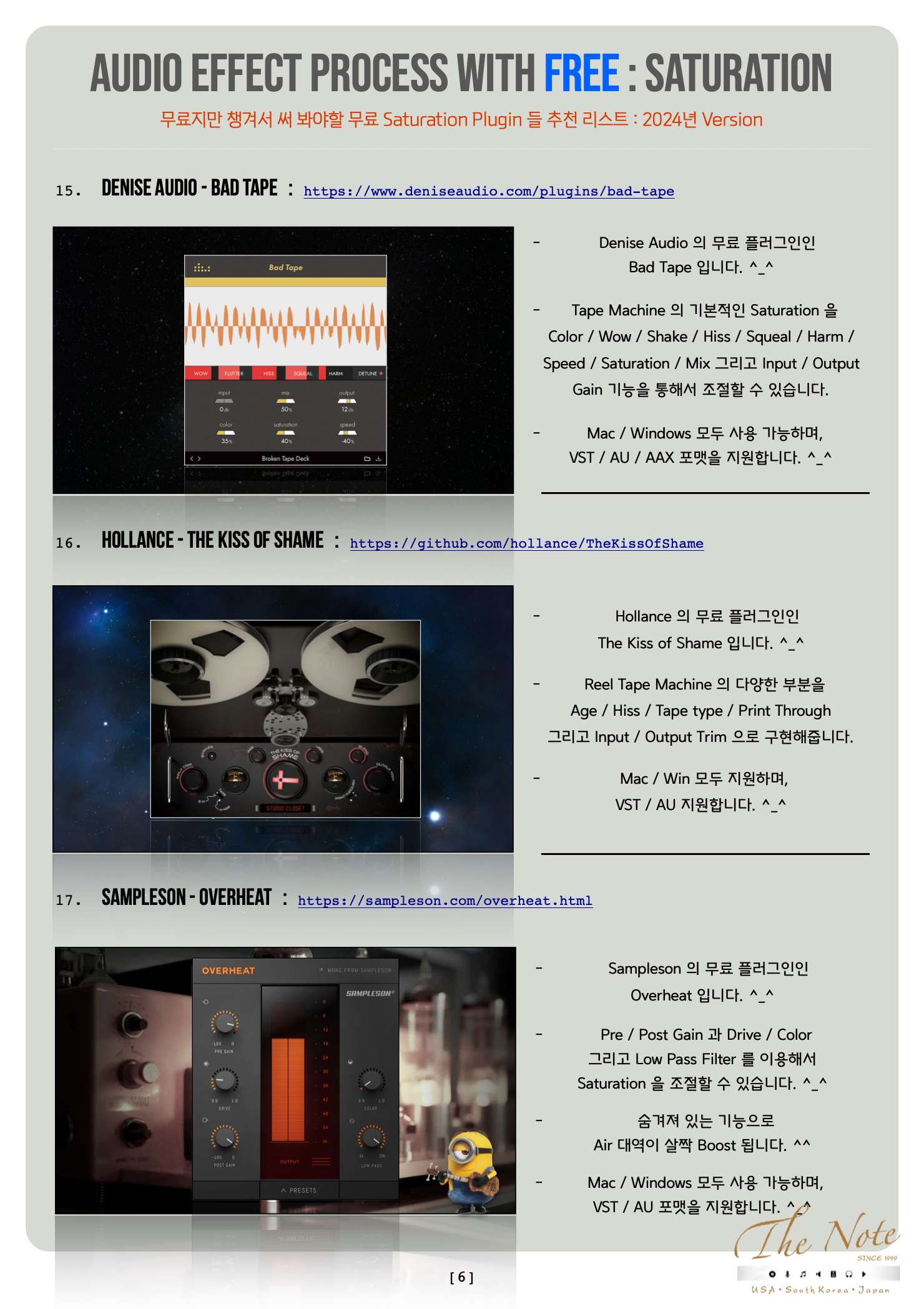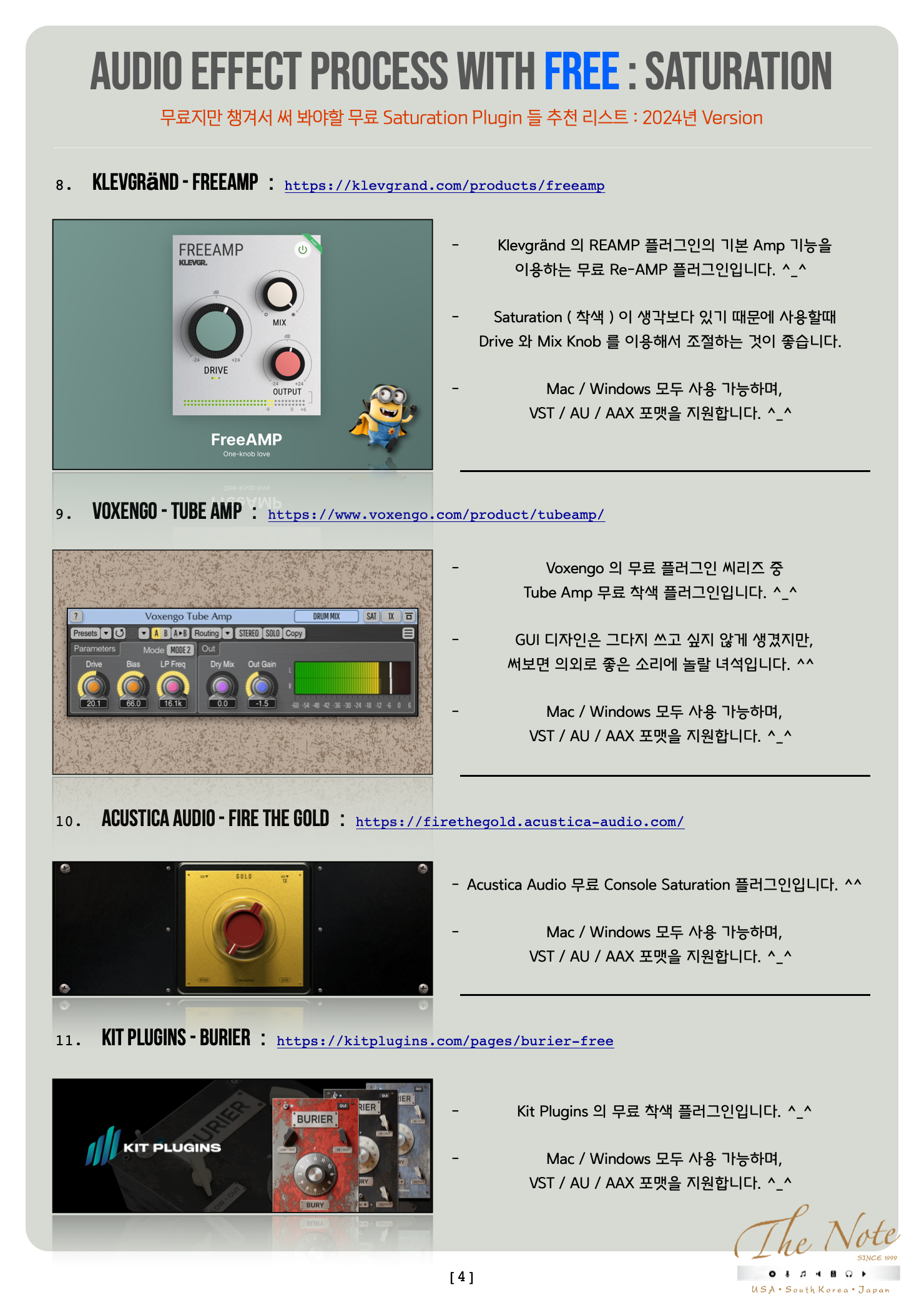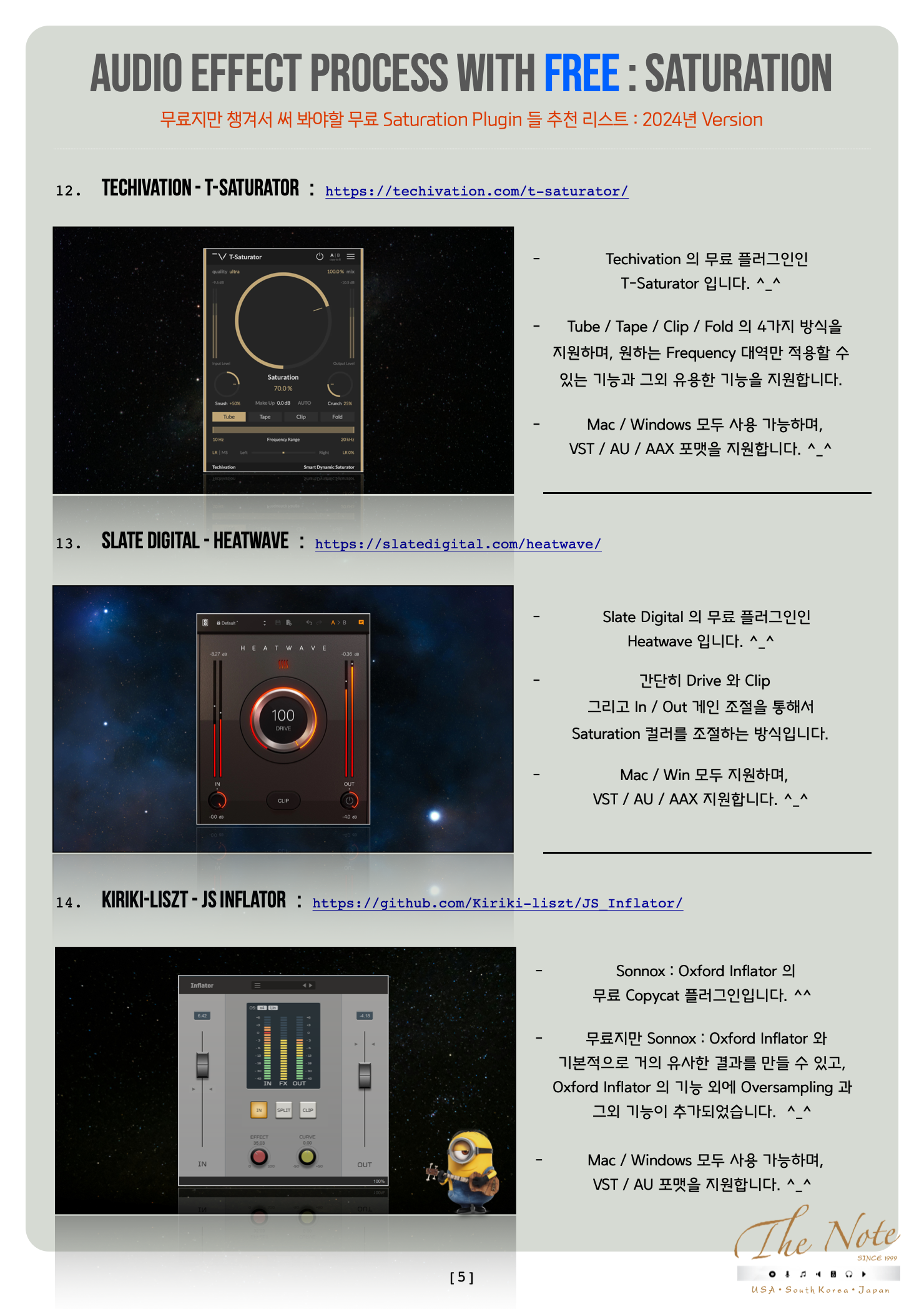 Audio Effect Process with Free Saturation 무료지만 챙겨두어야 할 무료 Saturation Plugin Download Guide : 2022 Audio Effect Process with FREE : Saturation 오늘은 무료지만 챙겨서 써 봐야할 무료 Saturation Plugin 들 추천 리스트를 정리해서 올려봅니다. ^_^ 기존에 유료 Saturation 을 사용하는 분들도, 이제 새로 시작하는 분들도 꼭 한번 사용해보면 좋을 것들로 골랐습니다. ^^ 음악 작업을 하면서 소스의 Tone ( 톤 ) 을 조절하기 위해서 Comp / EQ 뿐 아니라, 더불어서 Saturation 계열을 사용합니다. ^-^ Pre Amp / Console / Vacuum Tube Tape Machine / LP Vinyl / Harmonics Saturation Saturation Effect ( 착색 ) 계열은 정말 많은 목적과 방식이 있고, 각각의 목적과 방식에 따라서 필요한 Saturation Plugin 들도 다릅니다. ٩(の̀ᴗの́)و 하지만 그렇다고 용도에 따라서 유료 Plugin 을 다양하게 구매 하기에는 우리의 주머니가 가벼워질 수 있으니 이럴때 써 보시라고 무료지만 유료만큼이나 유용해서 챙겨서 써 봐야할 무료 Saturation Plugin 추천 리스트 를 올려봅니다. ^-^ 무료 플러그인이라고 무시하지 마시고, 꼭 한번 작업에 써 보시면 “ 어~ ” 할 것들로 골라봤습니다. ^^ 추천 무료 Saturation Plugin 들 즐겁게 사용해보세요. ^-^ The Note 무료지만 챙겨서 써 봐야할 무료 Saturation Plugin 들 추천 리스트 : 2022년 Version 대부분의 무료 Plug-in 은 그냥 받을 수 있습니다만 일부 회사는 싸이트에서 계정 만들고 받으셔야 합니다. ^^ Windows 와 Mac 둘 다 사용 가능한 것들 위주로 추천 리스트 만들었으니 편하게 받아서 사용하시면 됩니다. ^_^ TB Pro Audio - GSat Plus : https://www.tbproaudio.de/products/gsatplus TB Pro Audio 의 CS5501 Channel Strip 플러그인의 알고리즘을 기반하고 있는 착색 플러그인입니다. ^_^ 개별 Channel 에 쓰기에도 좋고, Group 채널에 활용하기에도 좋습니다. Mac / Windows 모두 사용 가능하며, VST / AU / AAX 포맷을 지원합니다. ^_^ Klanghelm - IVGI : https://klanghelm.com/contents/products/IVGI.php Klanghelm 의 SDRR 플러그인의 알고리즘을 기반하고 있는 착색 플러그인입니다. ^_^ Reverb Solo 는 Reverb 라는 회사와 연계해서 만든 무료 버전입니다. Mac / Win 모두 지원하며, VST / AU / AAX 지원합니다. ^_^ Chowdhury DSP - Chow Tape Model : https://chowdsp.com/products.html Sony TC-260 Reel Tape Machine 을 기반한 Tape Machine 플러그인입니다.^^ 무료지만 어지간한 유료 플러그인을 사용하는 것만큼 쓰임새가 많은 착색 플러그인입니다. ^_^ Mac / Windows 모두 사용 가능하며, VST / AU / AAX 포맷을 지원합니다. ^_^ Softube - Saturation Knob : https://www.softube.com/saturationknob Softube 의 무료 Saturation ( 착색 ) 플러그인입니다. ^^ 간단한 Knob 하나와 Saturation Type 을 바꾸는 것으로 Tone ( 톤 ) 조절이 가능한 플러그인입니다. ^_^ Mac / Windows 모두 사용 가능하며, VST / AU / AAX 포맷을 지원합니다. ^_^ Wave ARts - Tube Sat Vintage : https://wavearts.com/products/plugins/tube-saturator-vintage/ Wave Arts 의 무료 Vacuum Tube ( 진공관 ) 착색 플러그인입니다. ^_^ Mac / Windows 모두 사용 가능하며, VST / AU / AAX 포맷을 지원합니다. ^_^ Caelum Audio - Tape Cassette : https://www.caelumaudio.com/CaelumAudio/?Page=TapeCassette2 Caelum Audio 의 Tape Cassette 플러그인은 이름 그대로 카세트 테이프 머신 ( Cassette Tape Machine ) 을 기반한 무료 착색 플러그인입니다. ^_^ Mac / Windows 모두 사용 가능하며, VST / AU / AAX 포맷을 지원합니다. ^_^ iZotope - Vinyl : https://www.izotope.com/en/products/vinyl.html iZotope 의 Vinyl 플러그인은 LP Player 를 기반한 무료 착색 플러그인입니다. ^_^ LP Vinyl 의 착색을 Noise / Filter / Speed 등을 이용해서 구현하고 있으며, 심플하지만 다양한 Tone ( 톤 ) 을 얻을 수 있는 플러그인입니다. Mac / Windows 모두 사용 가능하며, VST / AU / AAX 포맷을 지원합니다. ^_^ Klevgränd - Freeamp : https://klevgrand.com/products/freeamp Klevgränd 의 REAMP 플러그인의 기본 Amp 기능을 이용하는 무료 Re-AMP 플러그인입니다. ^_^ Saturation ( 착색 ) 이 생각보다 있기 때문에 사용할때 Drive 와 Mix Knob 를 이용해서 조절하는 것이 좋습니다. Mac / Windows 모두 사용 가능하며, VST / AU / AAX 포맷을 지원합니다. ^_^ Voxengo - Tube Amp : https://www.voxengo.com/product/tubeamp/ Voxengo 의 무료 플러그인 씨리즈 중 Tube Amp 무료 착색 플러그인입니다. ^_^ GUI 디자인은 그다지 쓰고 싶지 않게 생겼지만, 써보면 의외로 좋은 소리에 놀랄 녀석입니다. ^^ Mac / Windows 모두 사용 가능하며, VST / AU / AAX 포맷을 지원합니다. ^_^ Melda Production - MFree FX Bundle : https://www.meldaproduction.com/MFreeFXBundle Melda Production 의 무료 플러그인 번들입니다. ^_^ Mac / Windows 모두 사용 가능하며, VST / AU / AAX 포맷을 지원합니다. ^_^ Kit Plugins - Burier : https://kitplugins.com/pages/burier-free Kit Plugins 의 무료 착색 플러그인입니다. ^_^ Mac / Windows 모두 사용 가능하며, VST / AU / AAX 포맷을 지원합니다. ^_^Techivation - T-Saturator : https://techivation.com/t-saturator/ Techivation 의 무료 플러그인인 T-Saturator 입니다. ^_^ Tube / Tape / Clip / Fold 의 4가지 방식을 지원하며, 원하는 Frequency 대역만 적용할 수 있는 기능과 그외 유용한 기능을 지원합니다. Mac / Windows 모두 사용 가능하며, VST / AU / AAX 포맷을 지원합니다. ^_^ Slate Digital - Heatwave : https://slatedigital.com/heatwave/ Slate Digital 의 무료 플러그인인 Heatwave 입니다. ^_^ 간단히 Drive 와 Clip 그리고 In 